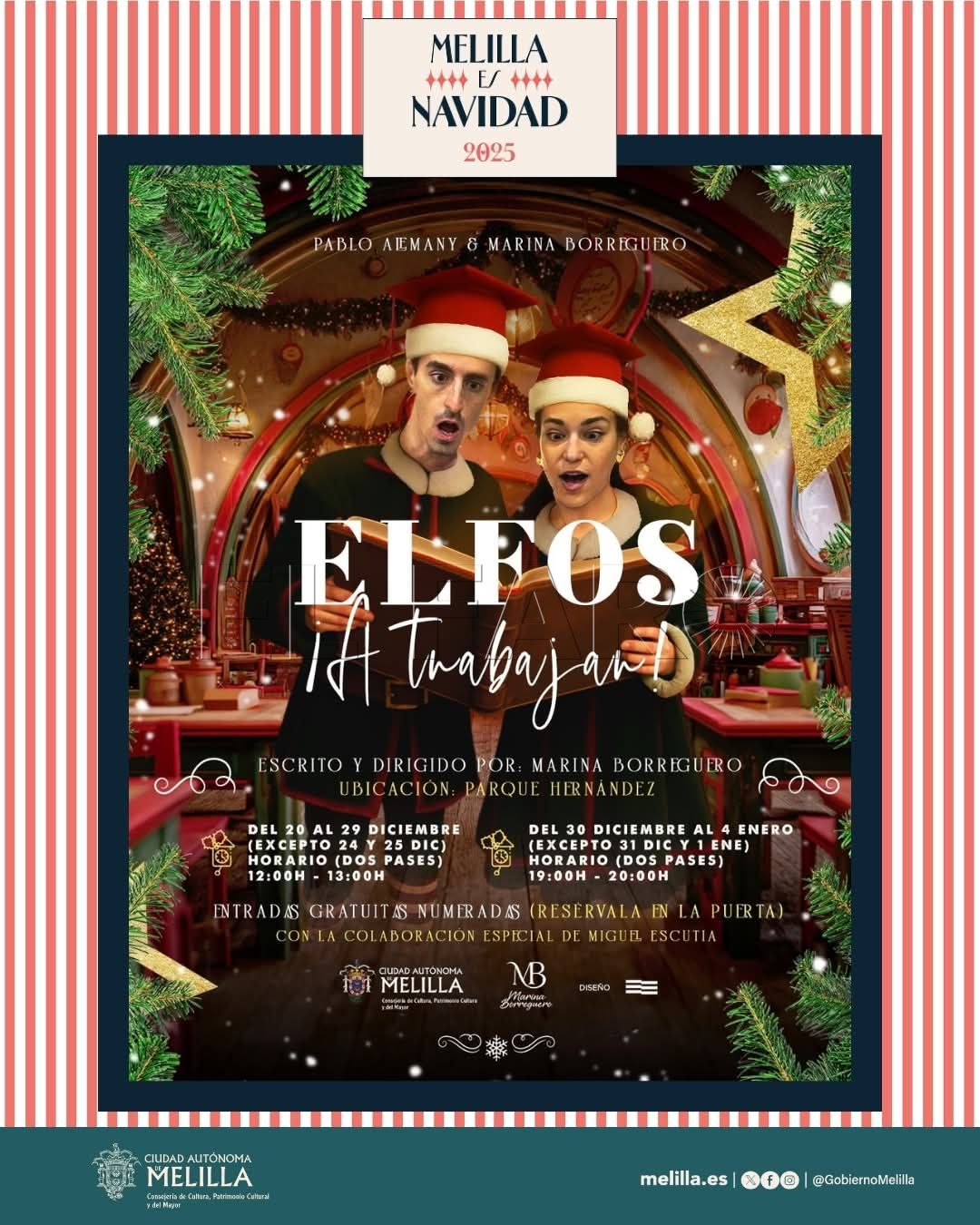 Dentro de la programación navideña de Melilla, hay un pequeño rincón donde la magia no se imagina, sino que permite ser parte de ella. En un container instalado en el Parque Hernández, cada día se abren las puertas a una experiencia teatral diferente, íntima, cálida y participativa: la obra “¡Elfos, a trabajar!”, escrita, dirigida e interpretada por Marina Borreguero, que comparte escena con el actor Pablo Alemany, convierte a niños y familias en protagonistas de una historia que solo puede suceder con su participación.