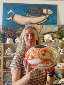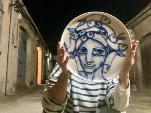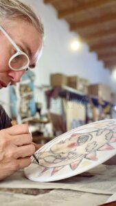 El estilo de Ana Uceda es difícil de encasillar. Sus obras combinan técnicas, soportes y estéticas. Puede pintar sobre un plato comprado o sobre uno creado por ella misma, trabajar con papel, lienzo o cerámica. “El barro no es corregible. Una vez hecho, ya está. Si no funciona, tienes que empezar de nuevo”, comenta. Esta técnica le ha enseñado paciencia —o al menos, ha intentado enseñársela— y la capacidad de aceptar el resultado, incluso cuando las sorpresas no son del todo las que esperabas obtener. “El horno te devuelve algo diferente a lo que tú metiste. A veces el resultado es grato, otras veces no”, sostiene con humor. El proceso cerámico se convierte así en una metáfora de la vida misma: se trabaja desde la intención, pero se acepta lo inesperado. Se aprende a perder y a recomenzar. Se suelta el control.