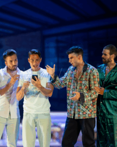 En escena, le acompañan tres actores de proyección nacional. Alejandro Vergara, actualmente en la serie La Promesa, que interpreta a Juan "el corazón del grupo” y quien ya había trabajado en la anterior obra junto con Caballero “; David Matarín, rostro de Sueños de libertad, que interpreta el papel de Andrés; y Almagro San Miguel, protagonista en La Moderna, quien debuta en Melilla con el personaje de Jose a pesar de que la obra se estrenó a principios de año.