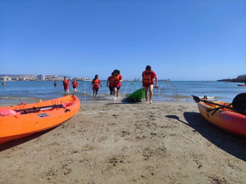 Mario, monitor responsable de la actividad, explica el reto en el que participarán 6 jóvenes por cada equipo. Se trata de arrastrar la embarcación desde la arena al mar, llegar a una de las boyas situadas al final del recorrido, rodearla y regresar remando. Una vez la embarcación llega a la orilla hay que disponerla de nuevo en su lugar fuera del agua y, entonces sí, se puede ir a ayudar a los compañeros que siguen en el mar. La norma implica activar un cronómetro antes de echarse al mar y pararlo cuando el último de los concursantes haya llegado a la orilla y situado el kayak en su lugar de origen. Manuel Soria, presidente de Travel Kayak Melilla es uno de los cinco colaboradores especializados en este deporte que han participado en el encuentro.