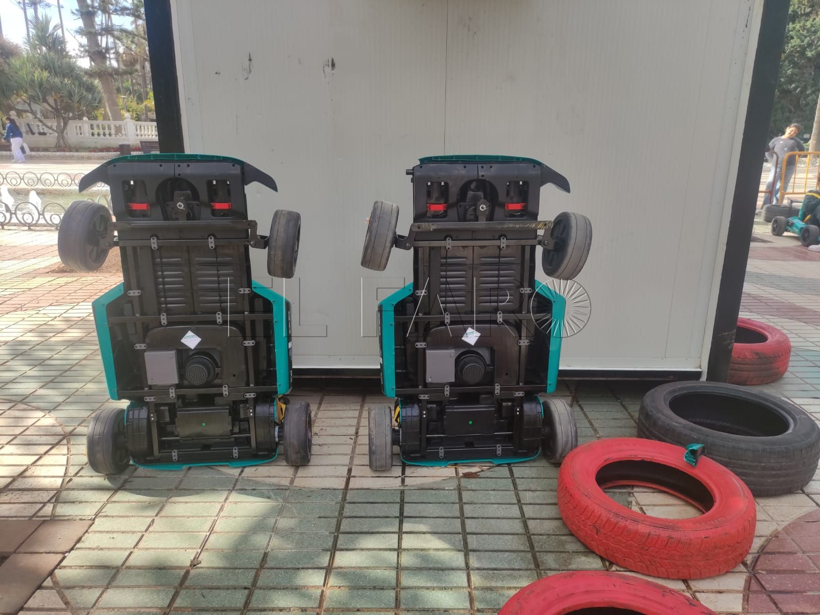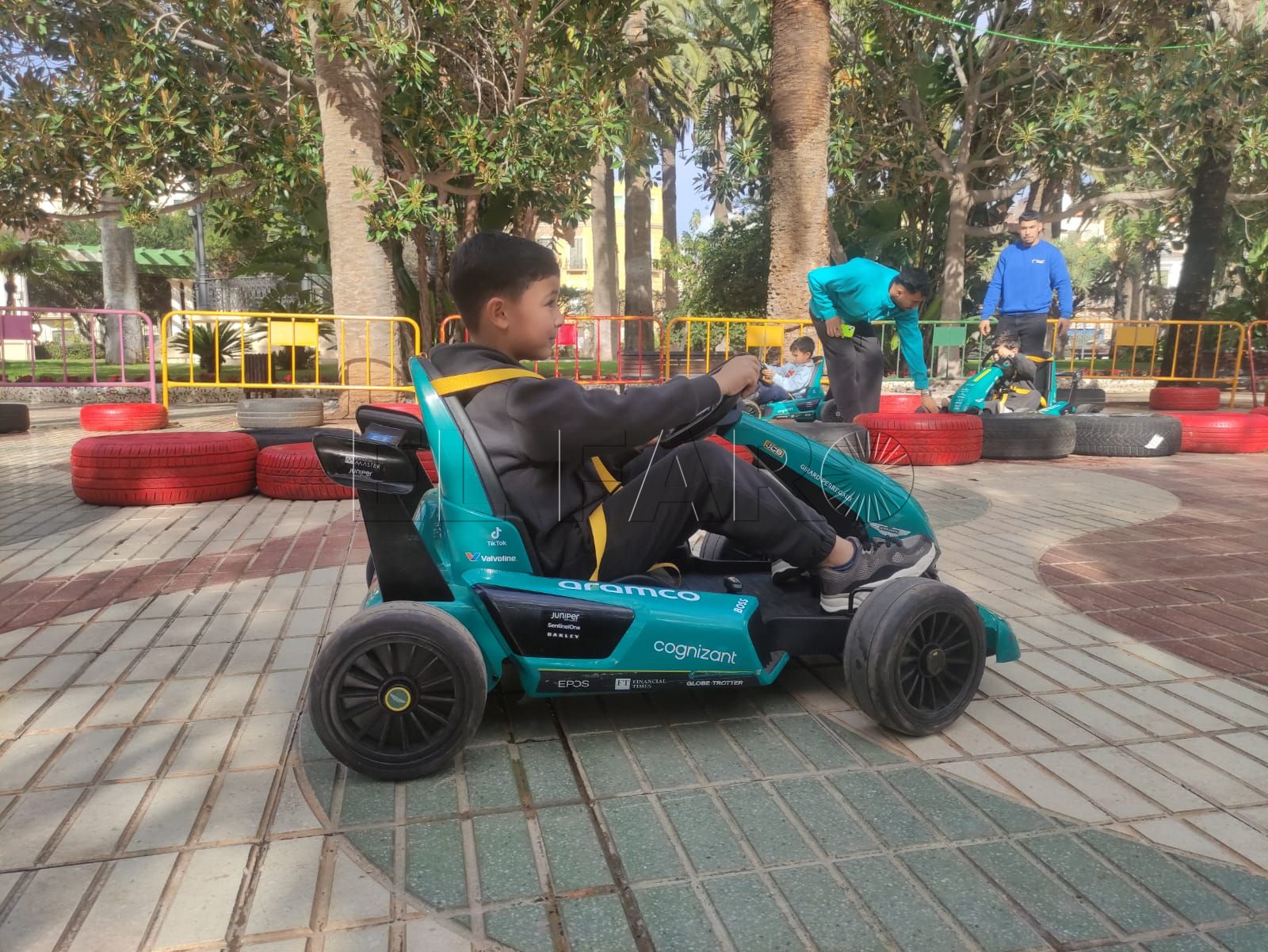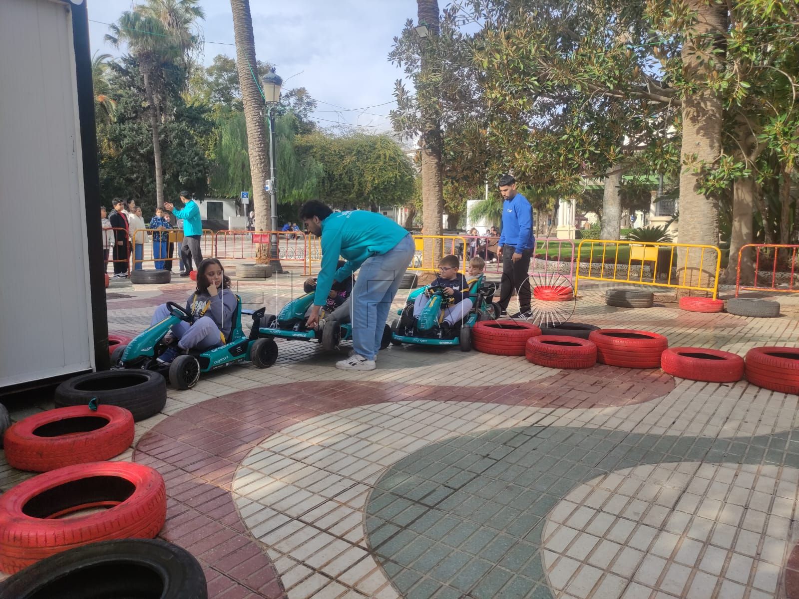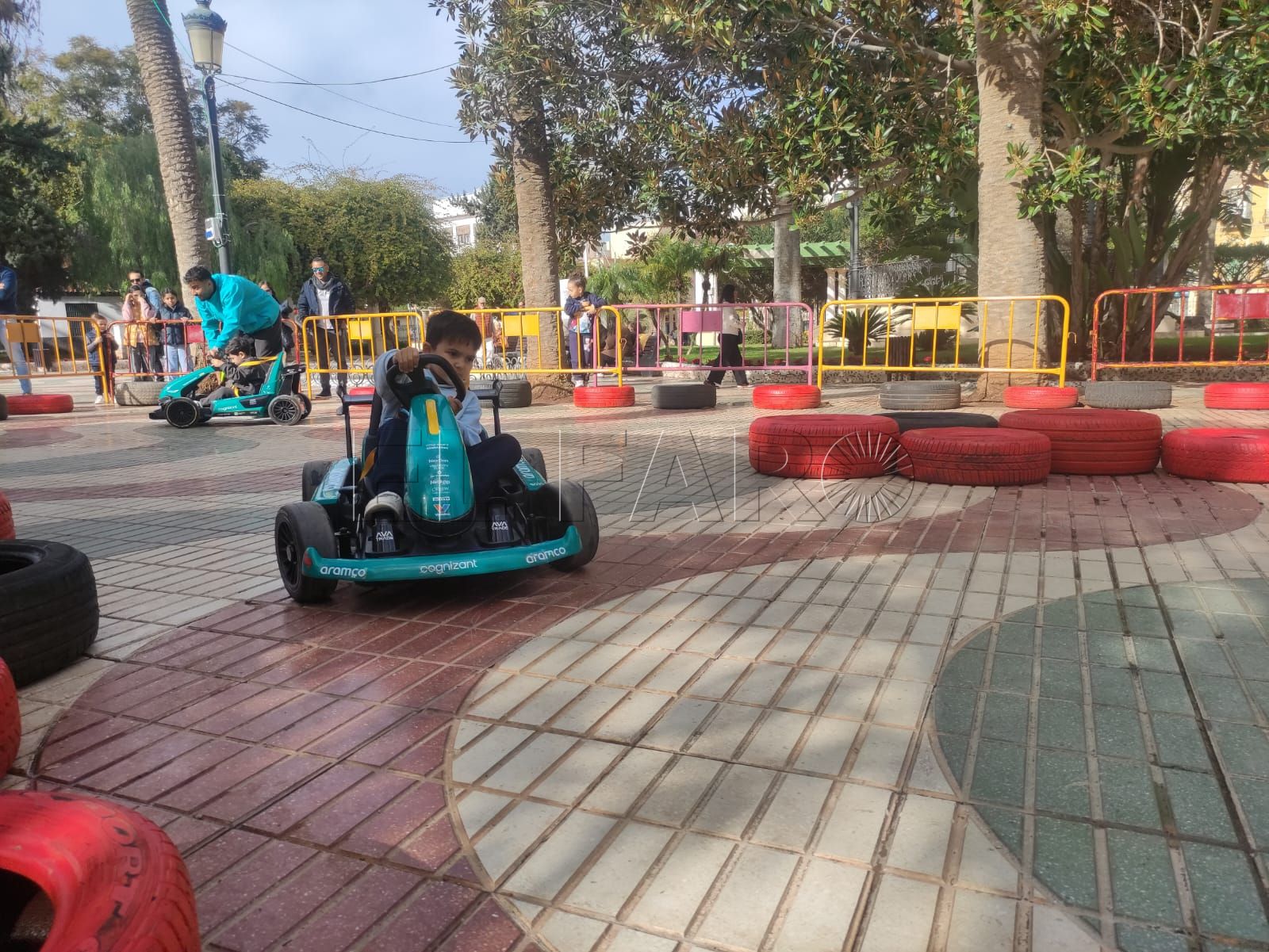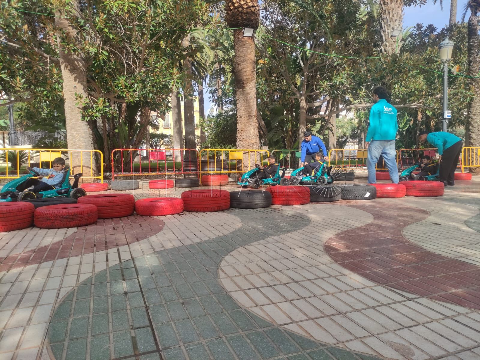 Los espacios de juego se llenan de movimiento, aprendizaje y muchas risas, siempre que el tiempo lo permita, pues muchas familias aprovechan las vacaciones para disfrutar de estas actividades. Los cars eléctricos son, sin duda, una de las grandes atracciones. Los niños acceden en grupos reducidos, reciben una pequeña explicación previa, se colocan el cinturón y aprenden el funcionamiento básico de estos vehículos adaptados. Como si de un pequeño coche automático se tratase, deben utilizar una palanca para avanzar, acelerar con el pie derecho y frenar con el izquierdo mientras recorren el circuito dispuesto entre neumáticos que dan forma al recorrido circular.