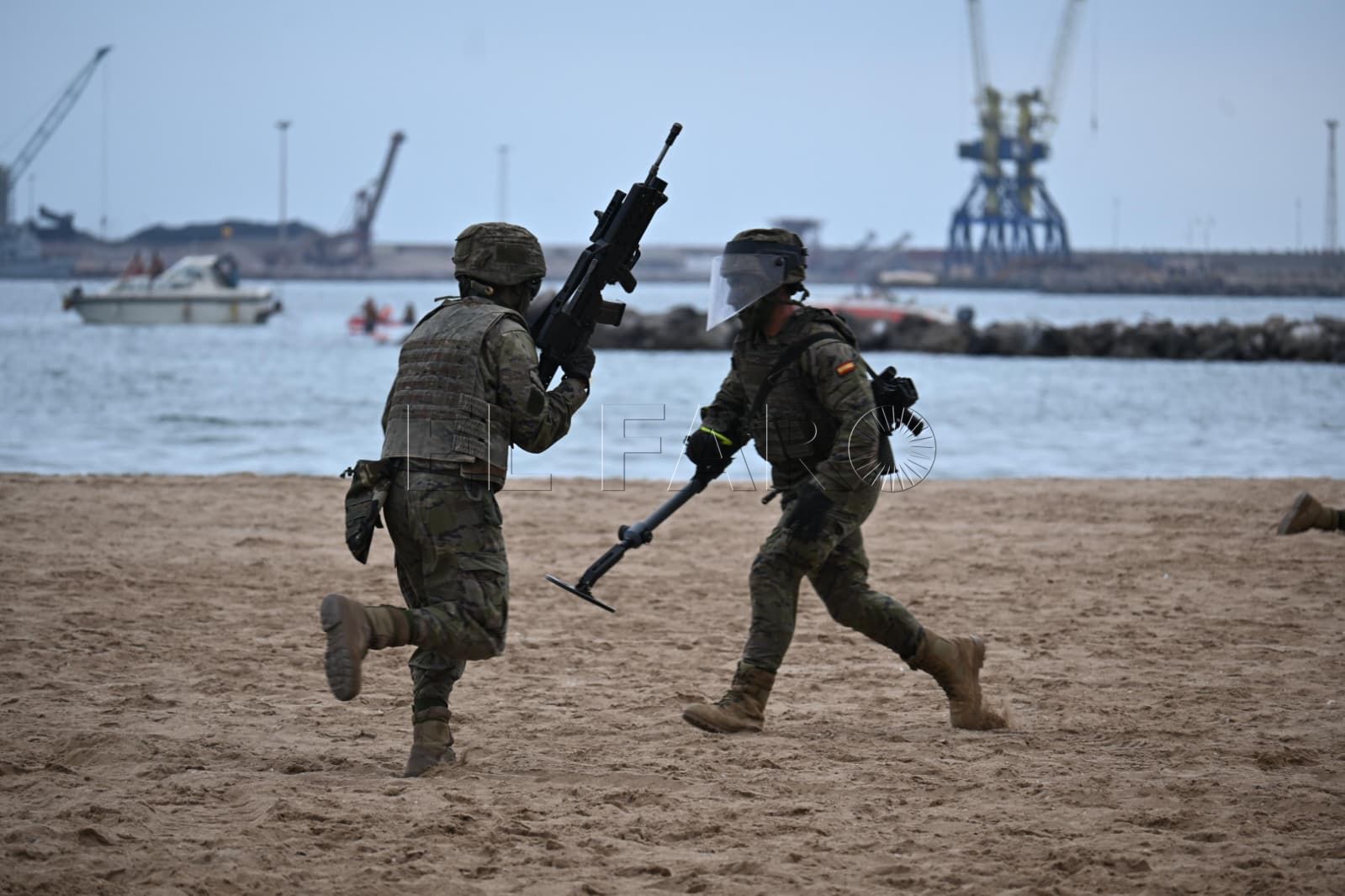 La operación ha contado también con el apoyo aéreo de un helicóptero NH-90, encargado de la vigilancia y la cobertura. Simultáneamente, buceadores del pelotón de navegación del RIN-8 han desplegado candelas flotantes para generar una cortina de humo que protegiera a las unidades. Una vez abierta la brecha, se ha señalado la zona con botes de humo verde para guiar a la infantería.