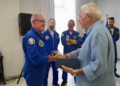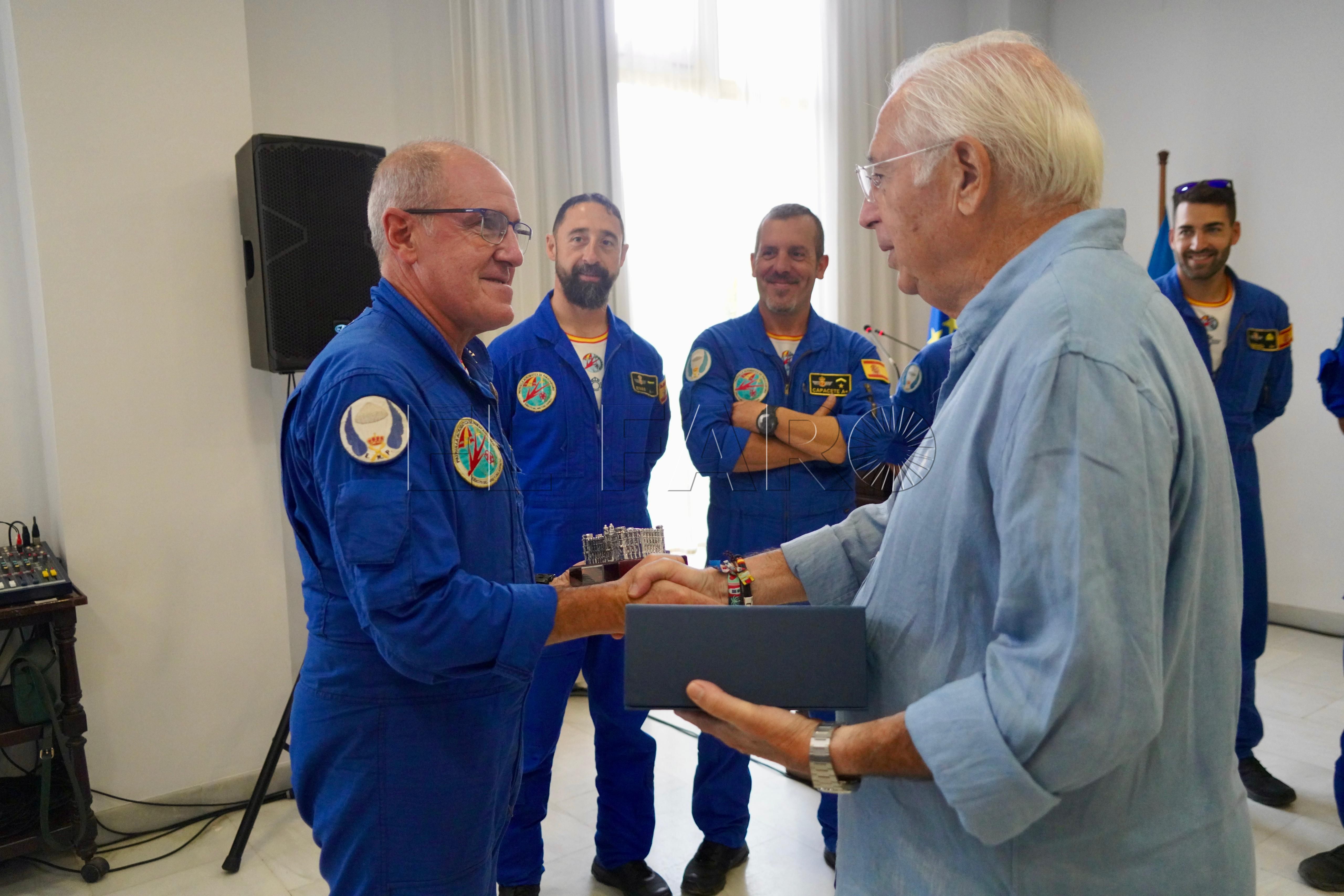 El presidente de la Ciudad, Juan José Imbroda, ha hecho entrega a Francisco Vico, miembro de la Patrulla Acrobática de Paracaidismo del Ejército del Aire y del Espacio, de un recuerdo de Melilla con motivo de su próximo paso a la situación de reserva.