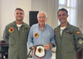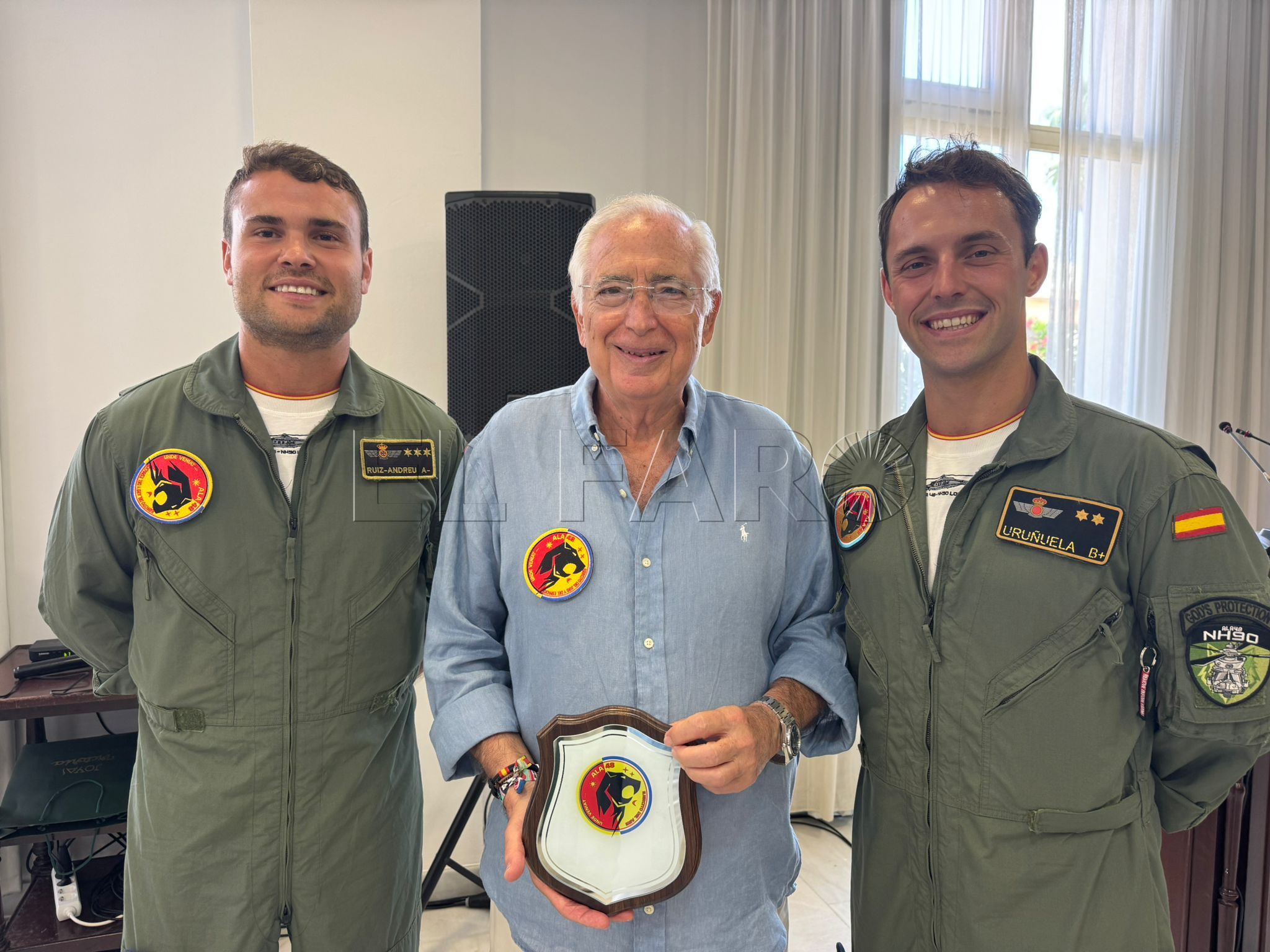 Además, los pilotos del helicóptero NH90 del ejército del aire, le han hecho también al presidente entrega de una metopa y el parche de la unidad.