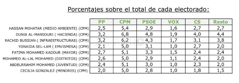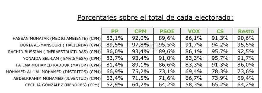 Sólo la consejera de Hacienda, Dunia Almansouri (97,8%), y el titular de Medio Ambiente, Hassan Mohatar (92%), son más reconocidos por sus votantes que por los de otras formaciones políticas. Ambos políticos tienen también un amplio apoyo (por encima del 90%) del electorado que se define como desencantado o que opta por la abstención (Resto).