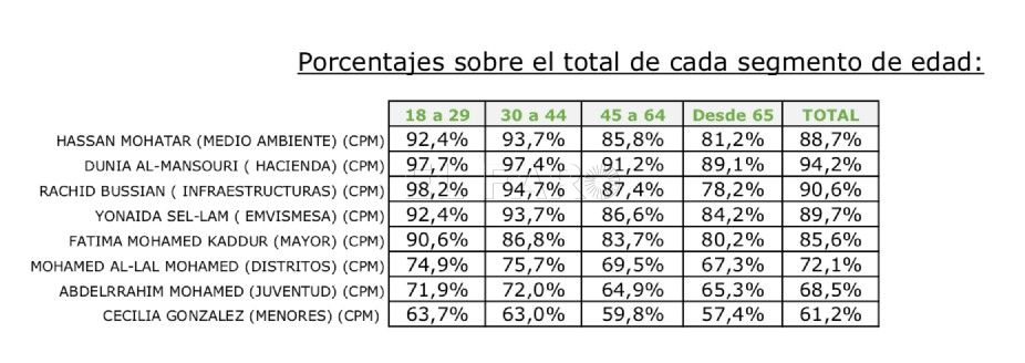 Menos conocidos son el consejero de Distritos, Mohamed Al-Lal (72,1%), Abderrahim Mohamed, responsable de Juventud (68,5%) y Cecilia González, encargada de Menores (61,2%).