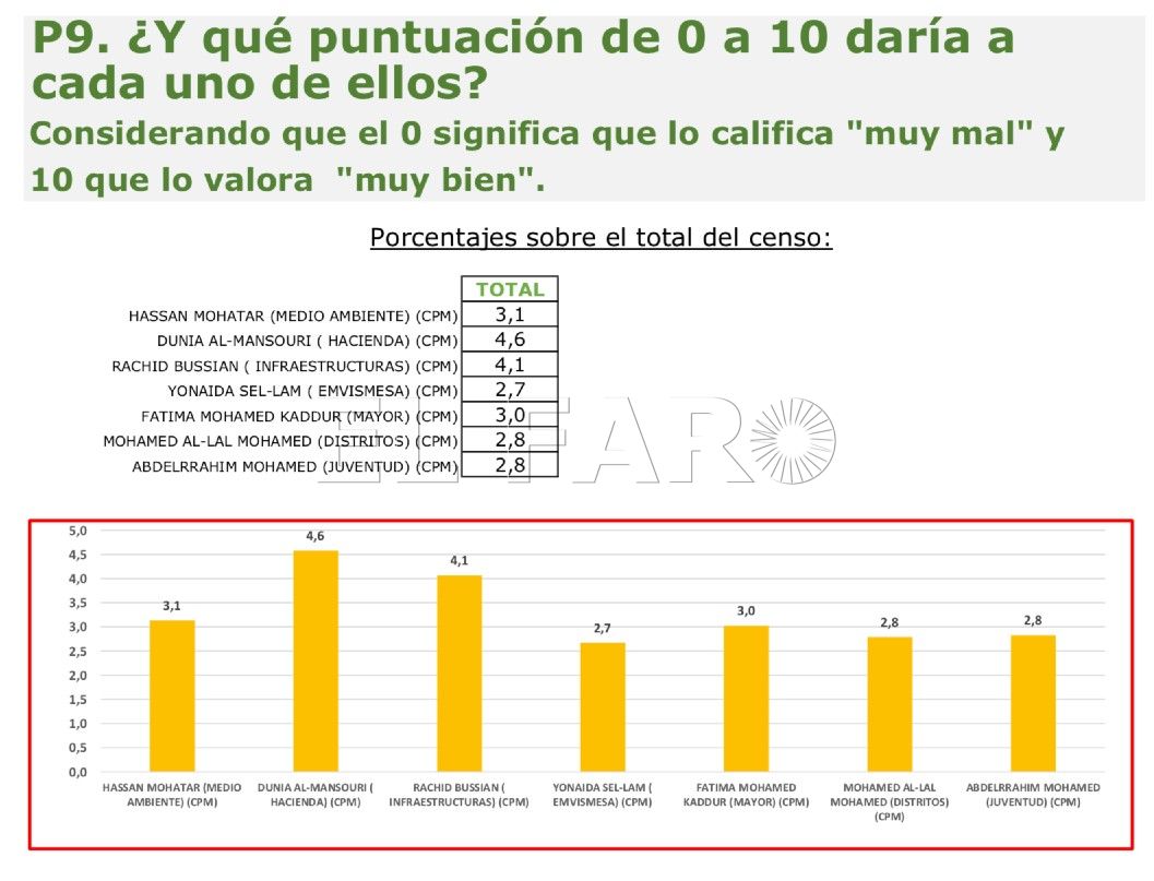 El ranking de valoraciones lo lidera Almansouri (4,6%), que supera a Aberchán (3%). También obtienen una valoración superior al líder de CpM Rachid Bussian (4,1%) y Hassan Mohatar (3,1%).