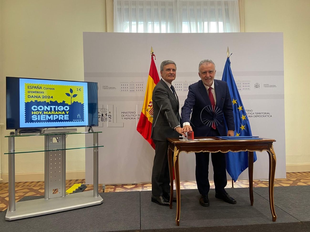 Correos ha presentado un sello dedicado a homenajear a las víctimas de la DANA 2024 bajo el lema “Contigo hoy, mañana y siempre”. Al acto de presentación han asistido el ministro de Política Territorial y Memoria Democrática, Ángel Víctor Torres Pérez, la comisionada especial del Gobierno para la reconstrucción y reparación de los daños provocados por la DANA, Zulima Pérez i Seguí, y el presidente de Correos, Pedro Saura García. Al finalizar el acto se ha llevado a cabo el tradicional matasellado del honor.