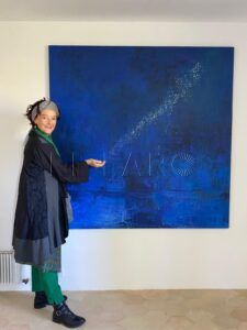 Las dos piezas de menor formato completan la propuesta desde otro ángulo y refuerzan un eje esencial: la tensión entre caos y orden. En la parte inferior aparece una materia más impulsiva, una gestualidad que roza lo salvaje; por encima se despliega un azul que actúa como bóveda, límite y equilibrio. La artista lo describe con claridad: ese azul “condensa y ordena todo este caos de la tierra”. Para ella, el caos no es un error; es el inicio. Es lo primero que brota cuando lo vivo aparece sin estructura, cuando la emoción llega antes que la forma.