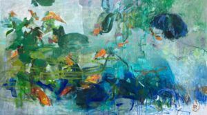 “Son tres obras: un cuadro grande y dos pequeños”, comenta. Ese formato funciona como una idea que se despliega en distintas respiraciones. En la pieza principal, el agua se asienta en la parte inferior y, por encima, la vegetación irrumpe con fuerza. La primera impresión es física: materia viva, crecimiento, impulso. No hay intención de describir un lugar concreto con exactitud geográfica; lo que aparece es una sensación, una memoria convertida en color y ritmo.
