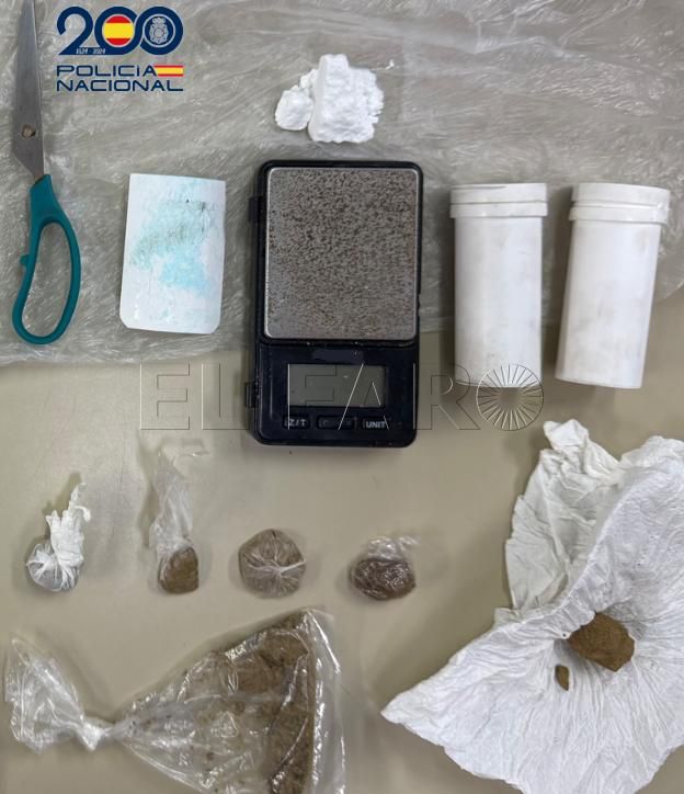 En concreto, se intervinieron cantidades de cocaína, incluida una roca de esta sustancia, así como numerosas dosis de hachís ya preparadas para su venta. Además, los agentes hallaron varios contenedores utilizados para la dosificación, una báscula de precisión y fragmentos de tijera con restos de sustancias estupefacientes.