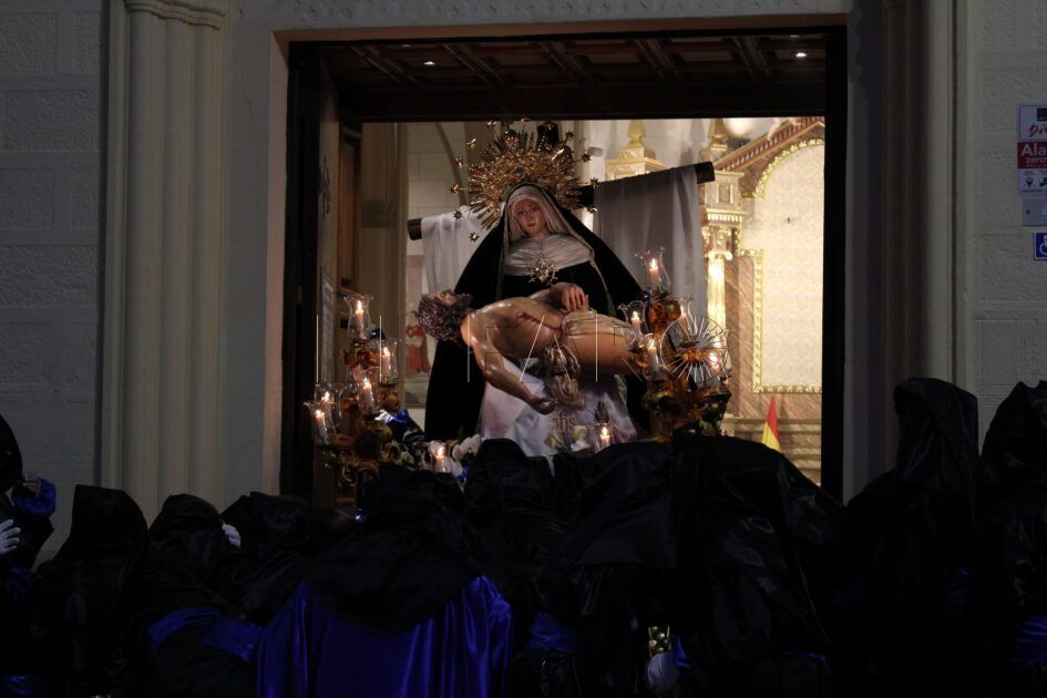 La cofradía procesiona el Martes Santo con la imagen de Nuestro Padre Jesús Humillado y el Viernes Santo con la Virgen de la Piedad y el Santísimo Cristo de la Buena Muerte. Conesa describe al Cristo Humillado como “un Cristo clemente, recién coronado de espinas, con su manto de color púrpura y con sus manos atadas”. Antes de la salida procesional, explica, se celebra un acto de desagravio a Cristo y posteriormente comienza la procesión. En cuanto a la imagen de la Piedad, señala que se trata del “Cristo yacente ya muerto en el regazo de la madre”, una representación que ha sido abordada por distintos artistas a lo largo de la historia.