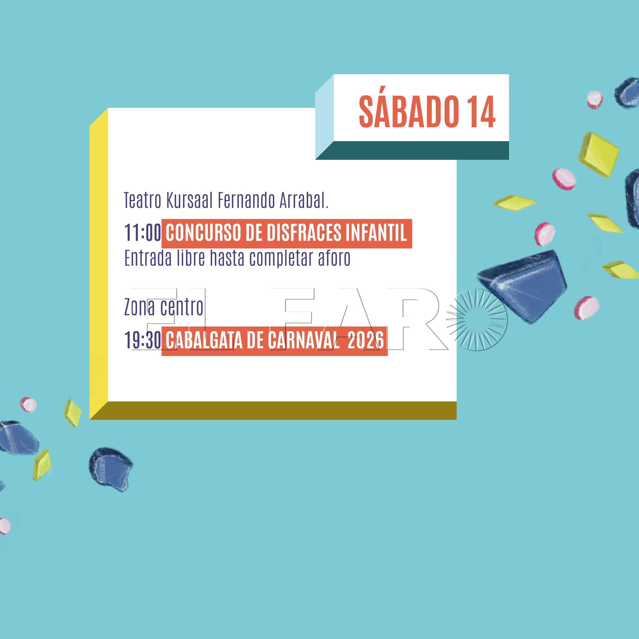El sábado 14 de febrero será el turno del público más joven con la celebración del Concurso de Disfraces Infantil, que se desarrollará a partir de las 11:00 horas en el Teatro Kursaal Fernando Arrabal, con entrada libre hasta completar aforo. Este certamen establece siete categorías con diferentes modalidades y dotaciones económicas, lo que permite una amplia participación. En Infantil Masculino e Infantil Femenino se concederán cinco premios por categoría, con cuantías que oscilan entre los 200 y los 500 euros.