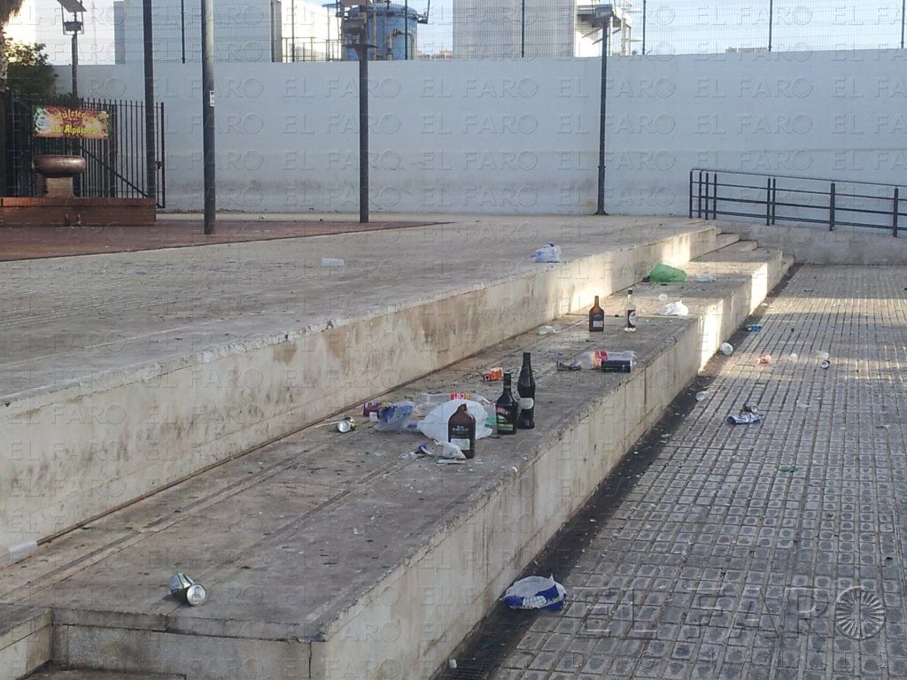 Las inmediaciones del Cargadero del Mineral amanecieron ayer con los restos de los ‘botellones’ o ‘botijos’ del fin de semana. Al filo del medio día, botellas, plásticos y cristales continuaban adornando las aceras y escaleras de acceso al Cargadero. Este problema lleva el camino del enquistamiento si las autoridades no se aplican en eliminarlo y dejar de hacer la vista gorda o los jóvenes y no tan jóvenes que practican este hábito se conciencian y una vez que terminen de beber, recogen los desperdicios y los tiran a la papelera. Los melillenses que transitan habitualmente por la zona reclaman una pronta solución que parece lejana en vistas del inicio de la Feria el próximo sábado.