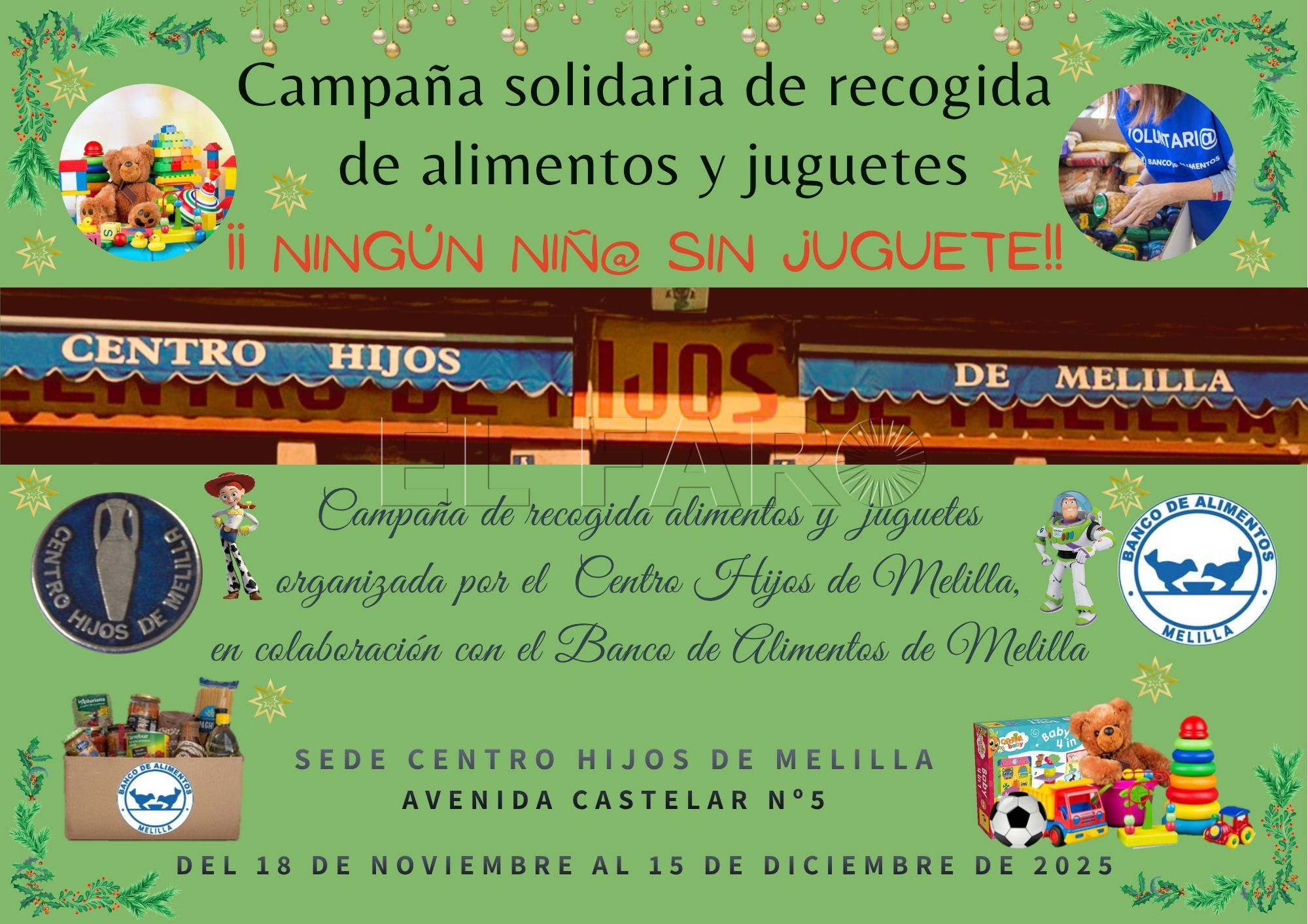 El Centro Hijos de Melilla y el Banco de Alimentos de nuestra ciudad se han unido en una campaña solidaria de recogida de alimentos y juguetes de cara a las próximas fechas navideñas que lleva por lema '¡Ningún niñ@ sin juguete!'.