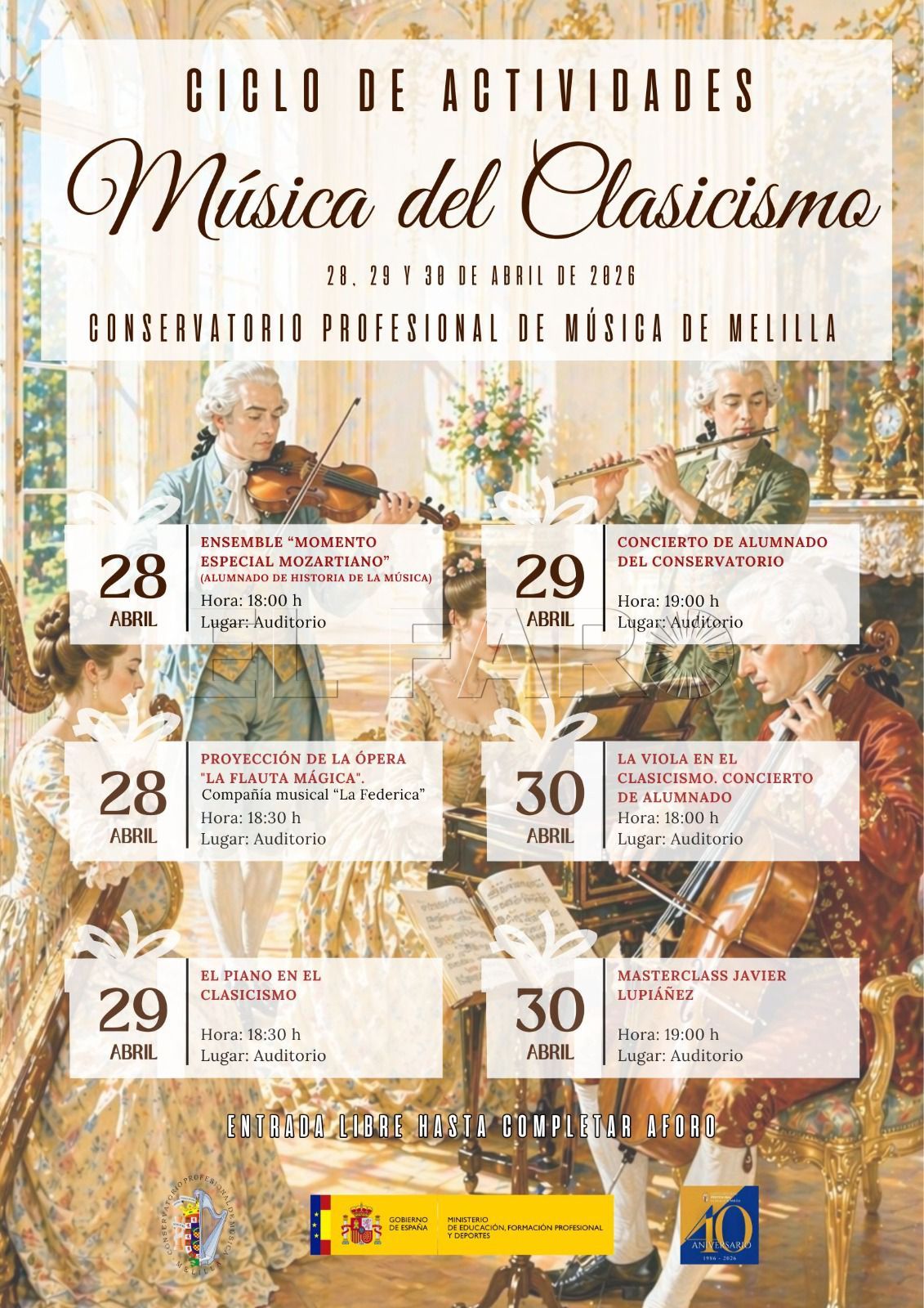 El concierto se enmarca, además, dentro del ciclo “Música del Clasicismo”, que se celebrará entre los días 28 y 30 de abril en el auditorio del conservatorio. Este ciclo incluye diversas actividades, desde conciertos del alumnado hasta proyecciones y propuestas formativas centradas en el repertorio clásico, configurando un espacio de aprendizaje y divulgación musical.
