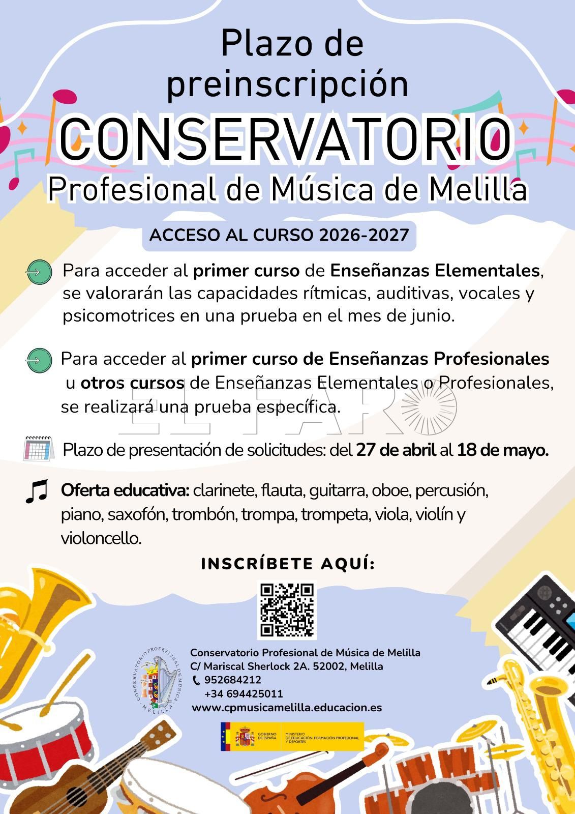 Coincidiendo con este programa conmemorativo, el Conservatorio Profesional de Música de Melilla ha abierto el plazo de preinscripción para el curso 2026-2027, que permanecerá activo desde el 27 de abril hasta el 18 de mayo.