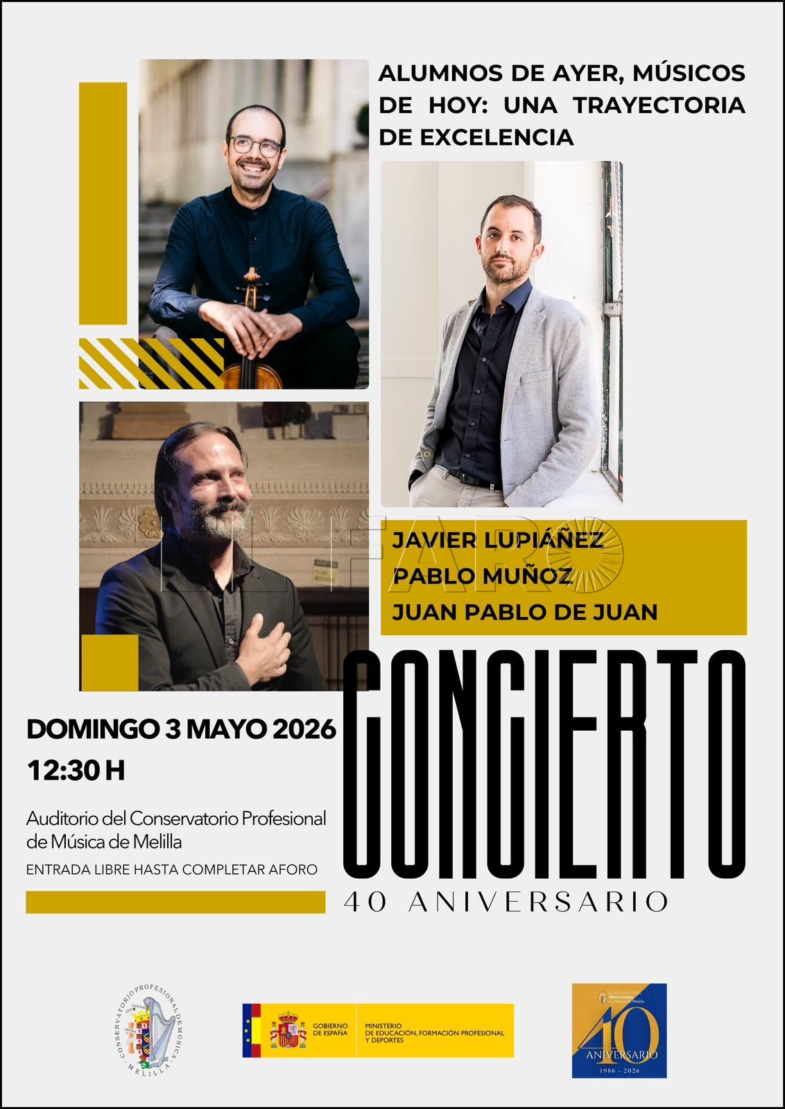 La propuesta del 3 de mayo reunirá sobre el escenario a tres antiguos alumnos del centro que han desarrollado carreras consolidadas en distintos ámbitos de la música: Javier Lupiáñez, Pablo Muñoz y Juan Pablo de Juan . La elección de estos perfiles responde a una intención clara por parte del equipo directivo: mostrar al alumnado actual que la formación musical puede derivar en trayectorias muy diversas y complementarias.