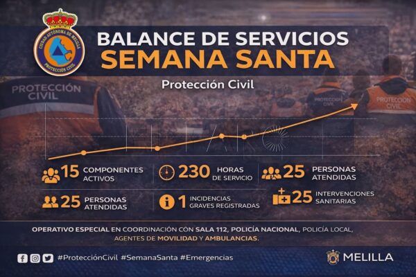 A lo largo de esta Semana Santa, Protección Civil de la Ciudad Autónoma ha implementado un dispositivo especial en el que ha desarrollado una intensa labor preventiva y asistencial para garantizar la seguridad de todos los melillenses y visitantes que han asistido a las distintas estaciones de penitencia que han recorrido las calles de nuestra ciudad.