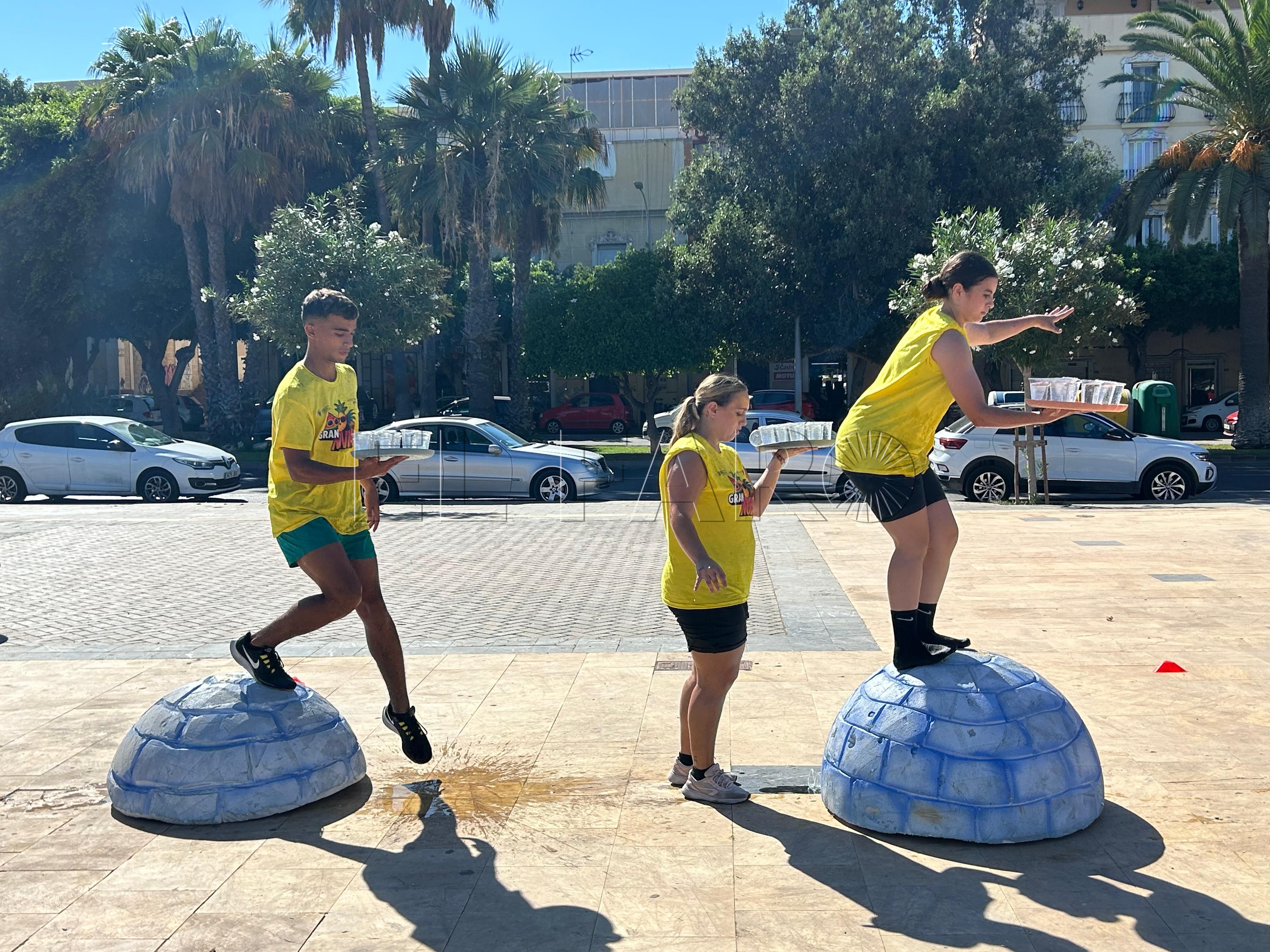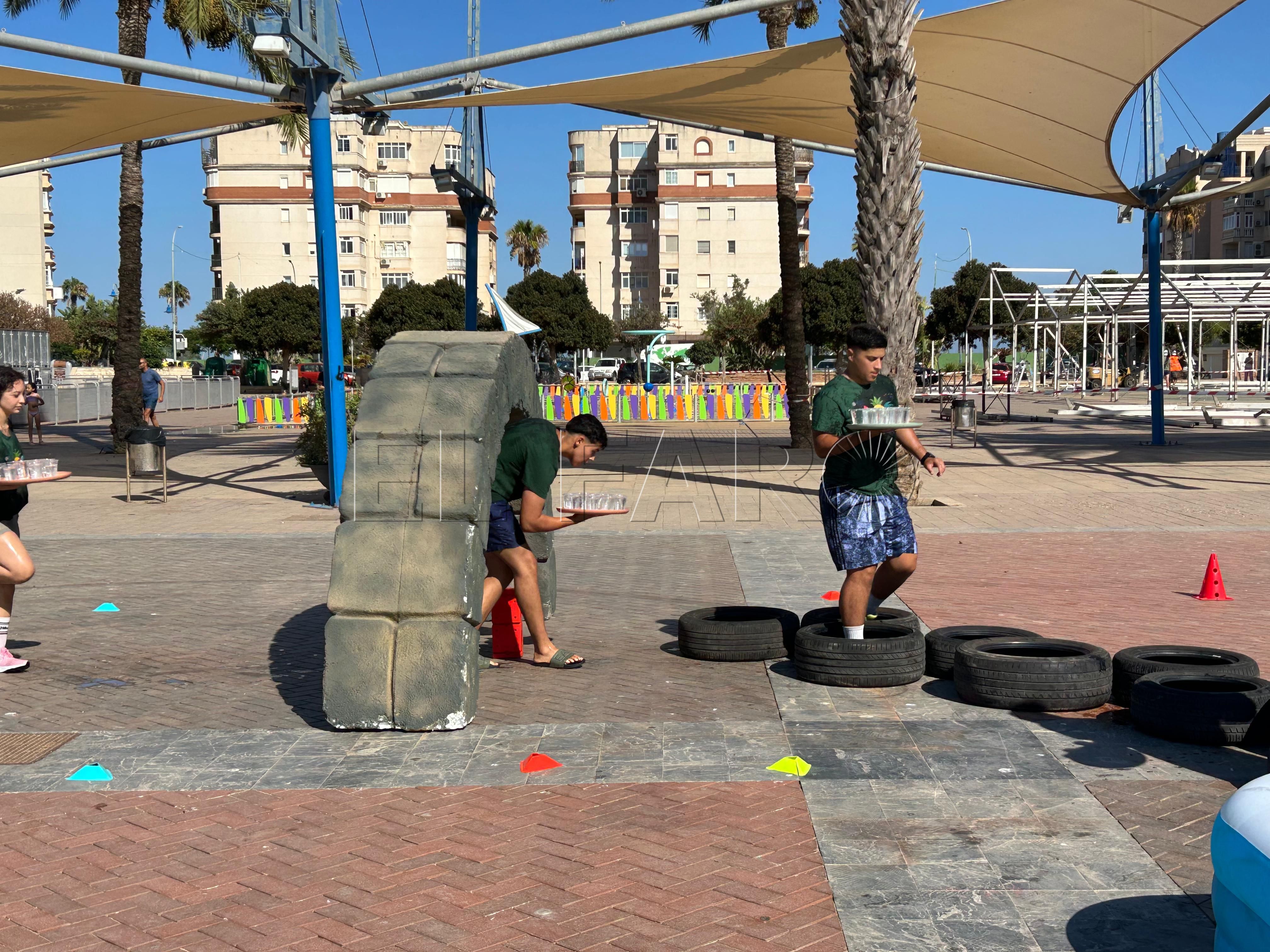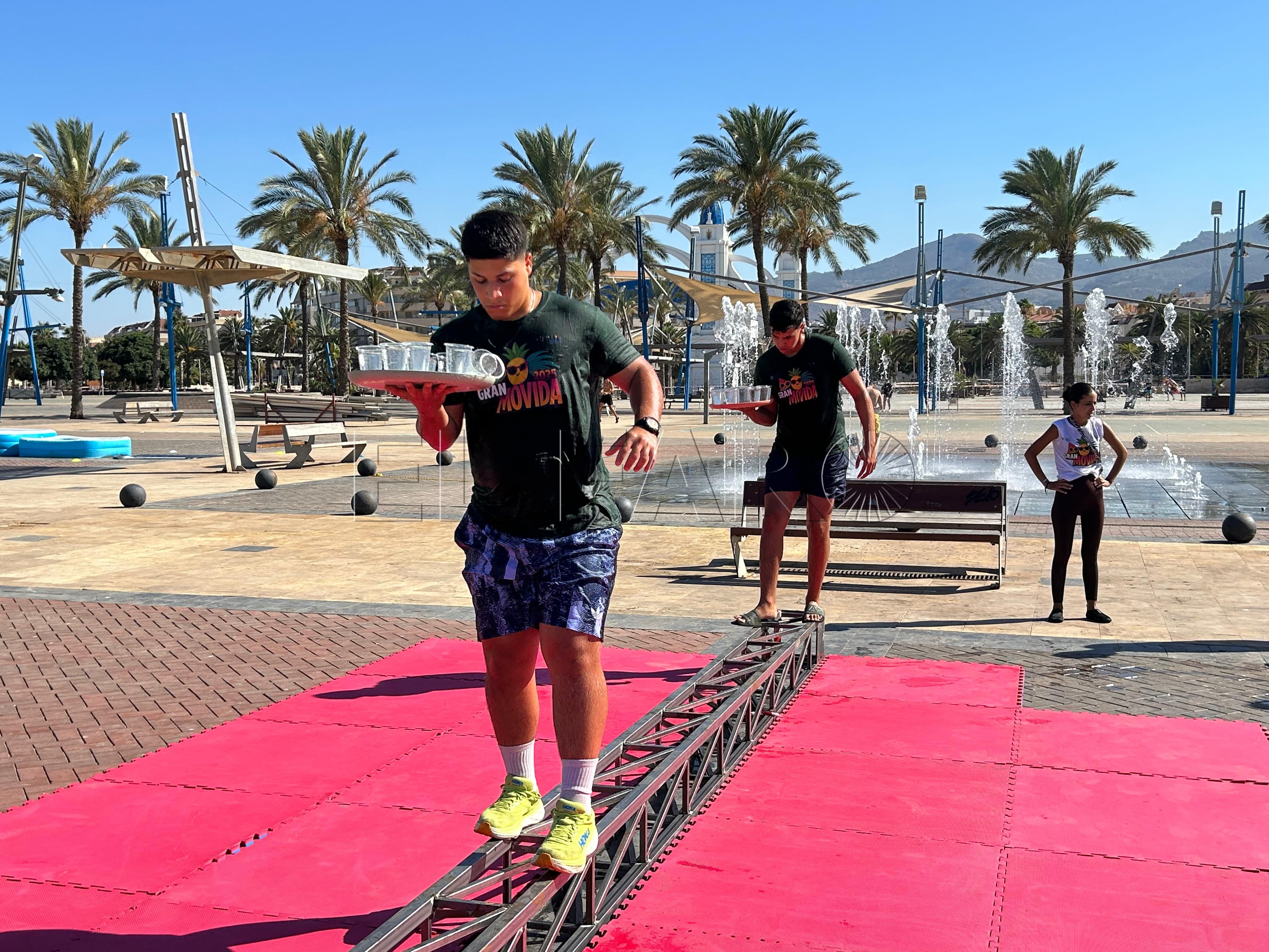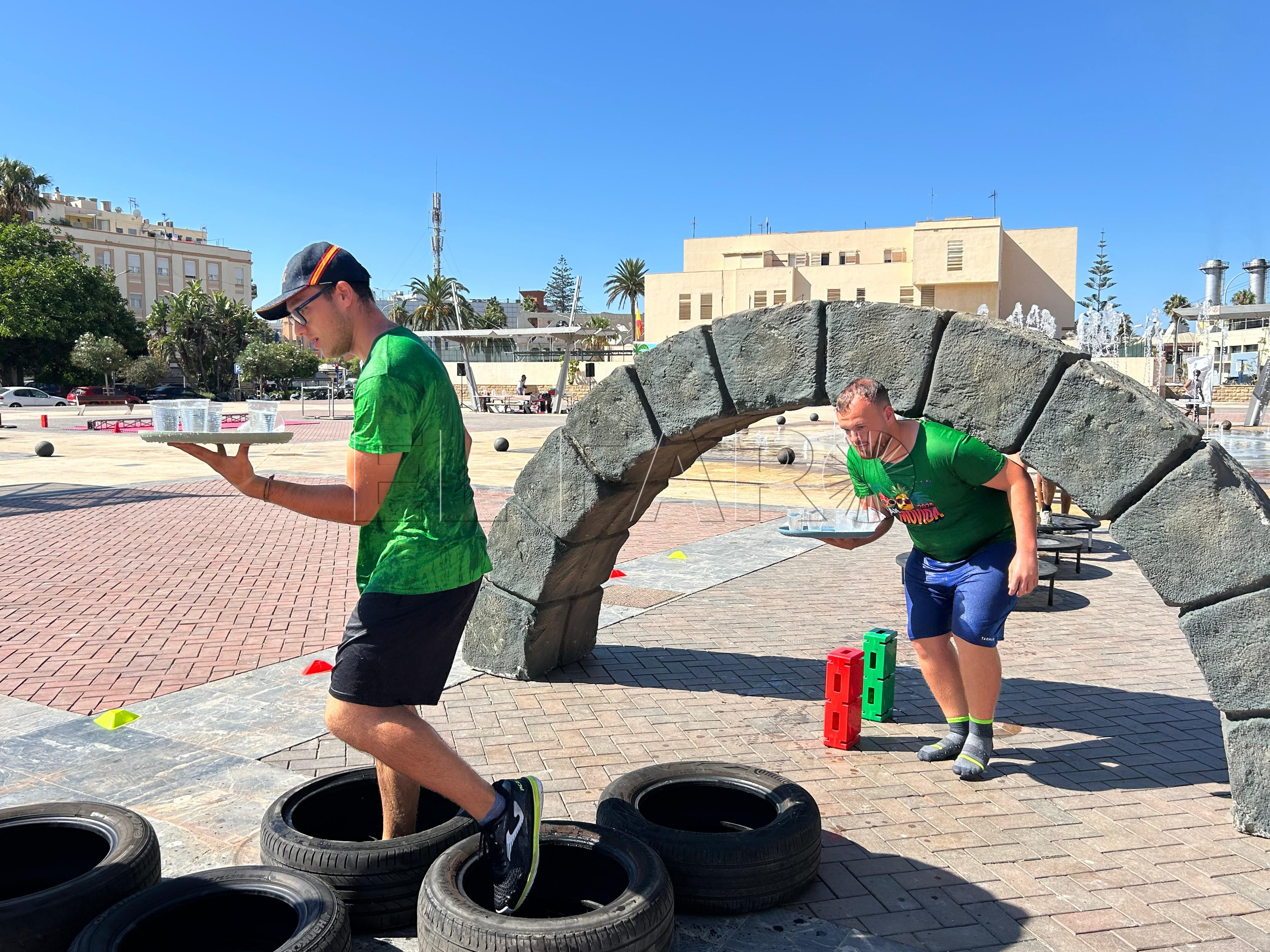 Ya por la tarde, los equipos se enfrentaron a una prueba de equilibrio y resistencia. Cada participante debía recorrer un circuito de obstáculos —con camas elásticas, ruedas, piscina y peanas inestables— portando una bandeja llena de vasitos de agua. El reto: mantener la mayor cantidad posible en dos minutos y medio y verterla en una garrafa al final del recorrido. El equipo con más agua acumulada se llevaba la mayor puntuación.