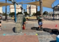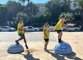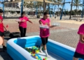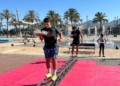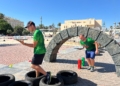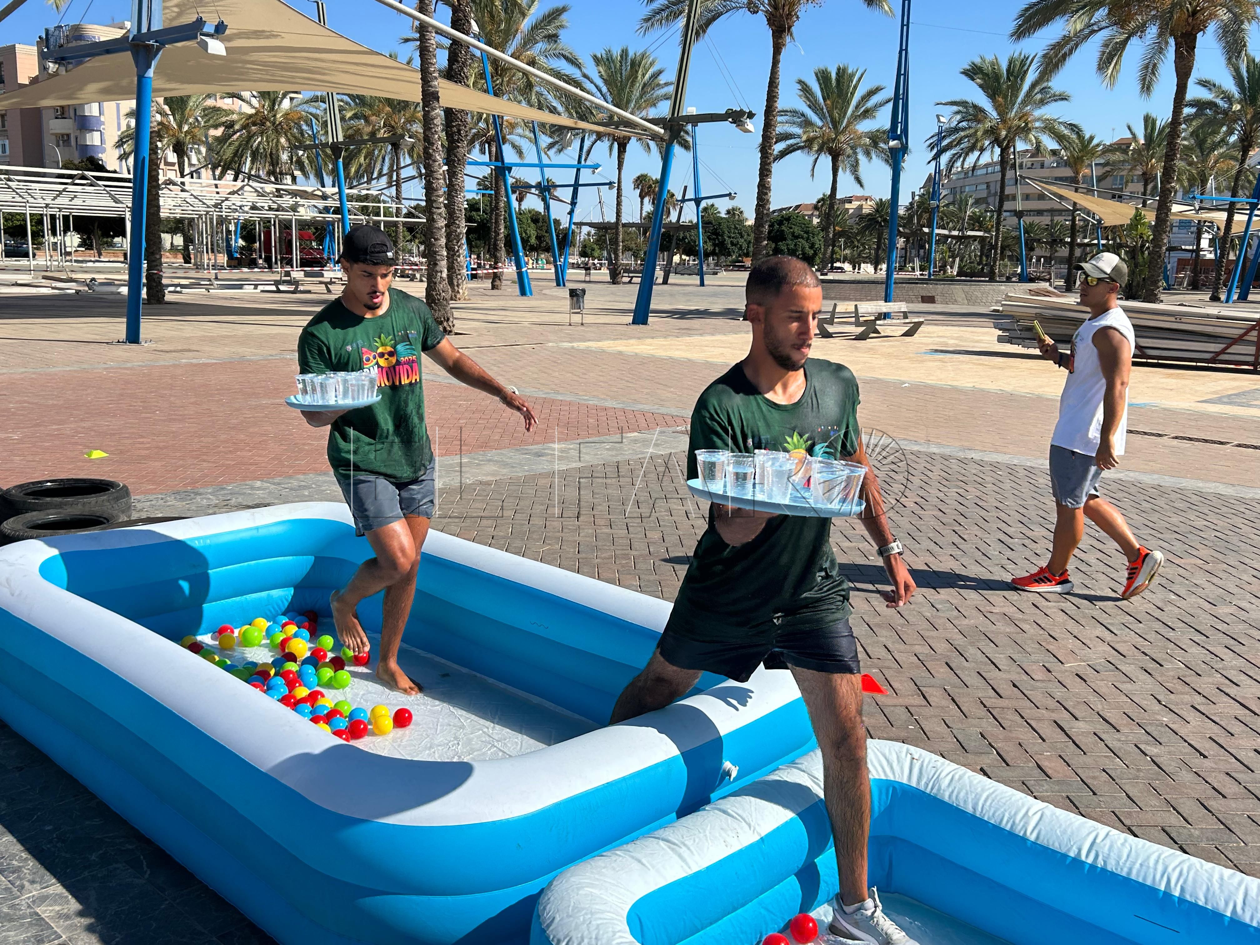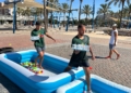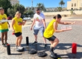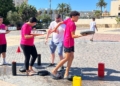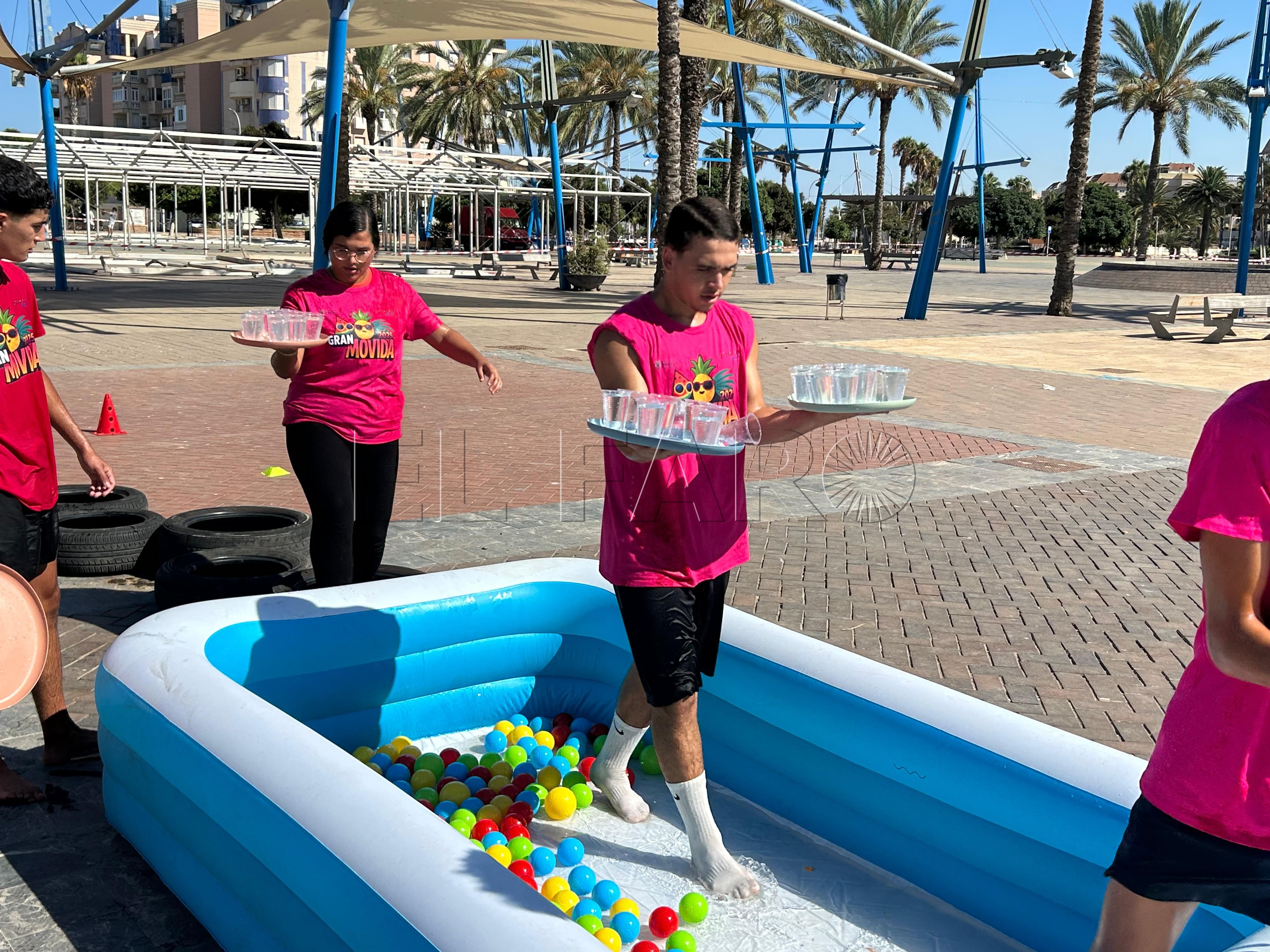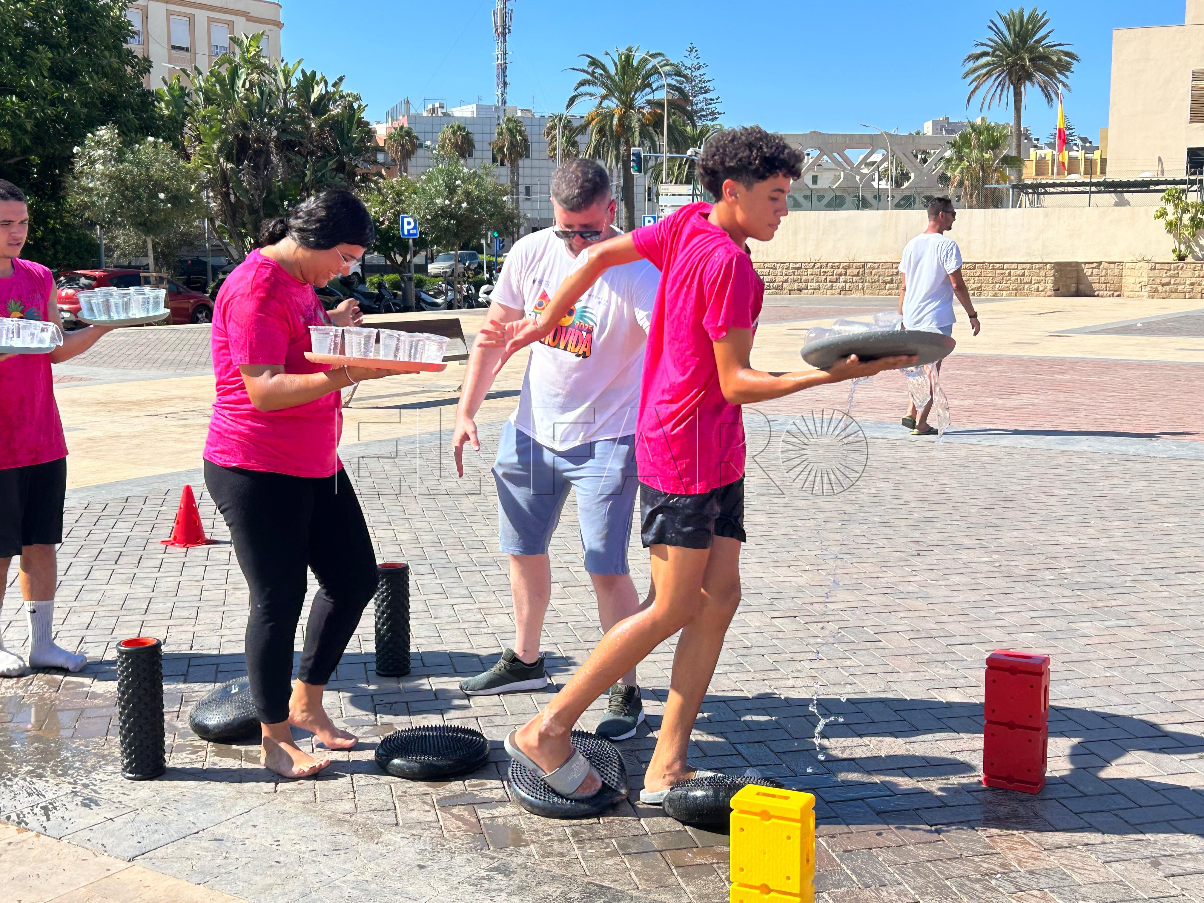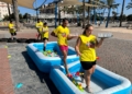 Ya por la tarde, los equipos se enfrentaron a una prueba de equilibrio y resistencia. Cada participante debía recorrer un circuito de obstáculos —con camas elásticas, ruedas, piscina y peanas inestables— portando una bandeja llena de vasitos de agua. El reto: mantener la mayor cantidad posible en dos minutos y medio y verterla en una garrafa al final del recorrido. El equipo con más agua acumulada se llevaba la mayor puntuación.