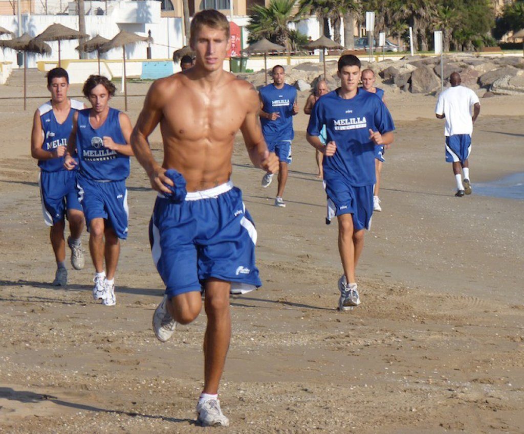 La plantilla del Melilla Baloncesto cambió el parquet del pabellón y el césped del campo de la Espiguera por la arena de la playa, en la que realizó la sesión de entrenamiento que tenía programada para ayer, que habitualmente se ha venido realizando sobre el césped artificial de la Espiguera.