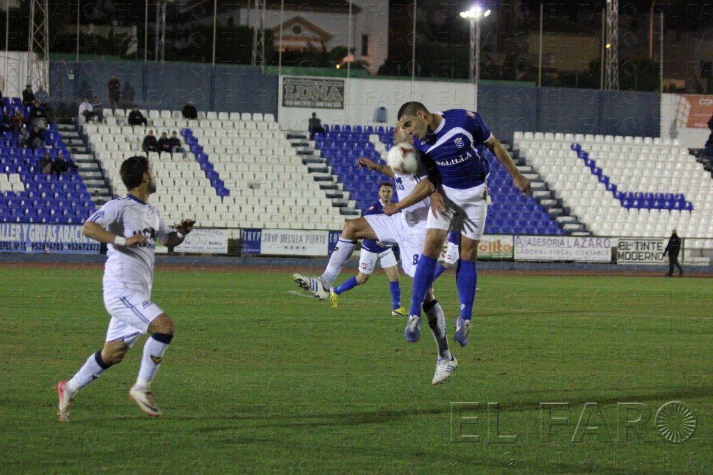 A los tres minutos, una internada de Velasco por banda derecha acabó con un centro raso hacia atrás que Jairo remató de manera defectuosa y el rechace llegó a De la Mota cuyo disparo rechazó también un defensor. Poco después Nico Varela estuvo a punto de conseguir un gol olímpico al lanzamiento de un saque de esquina, pero el cuero se estrelló en el travesaño de la meta defendida por Munir. Seis minutos más tarde, en el catorce, los visitantes pudieron adelantarse en el marcador pero el libre directo ejecutado desde la frontal por Fran Minaya lo repelió la cruceta. El mismo jugador estuvo a punto de sorprender a Munir con un disparo lejano que se marchó muy cerca del palo izquierdo del portal melillense. Robles también probó fortuna desde lejos pero su disparo se marchó alto. Velasco puso la réplica a pase de De la Mota aunque el cuero se marchó al lateral de la red. César Díaz, a la media vuelta, aprovechó un rechace de la defensa blanca pero la pelota se perdió por encima del larguero. Un minuto después, en el 33, de nuevo Velasco lo intentó sin fortuna y Varela finalizó de manera defectuosa un rápido contragolpe visitante. Al filo del descanso, Munir metió el puño de manera providencial para salvar una pelota que que colaba en su portería y el colegiado Benjumea Sánchez decretó el final del primer acto justo cuando los visitantes reclamaban un derribo de Titi en el área local.