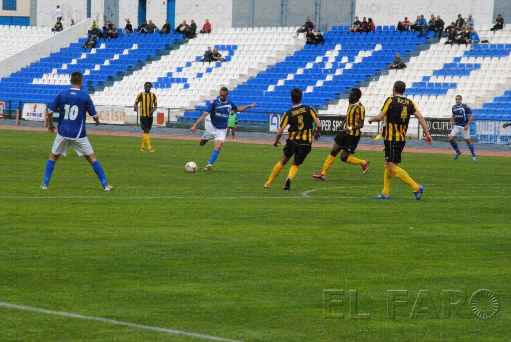 El Melilla seguía gustándose por momentos y así, poco antes de cumplirse la media hora de juego, Jairo Álvarez descargó el juego hacia la banda izquierda en la que Andrés Sánchez pasó sobre Amarito, el mejor hombre del partido, que centró al corazón del área, pero Chota no llegó al remate. Amarito volvió a ser el protagonista en la siguiente jugada al entrar como perico por su casa por la banda izquierda hasta llegar a la línea de fondo, desde donde fabricó un centro templado al segundo palo en el que se encontraba totalmente sólo César Díaz, que de perfecto cabezazo estuvo a punto anotar el segundo, pero el balón se estrelló en la poste izquierdo del portal defendido por Ricardo.