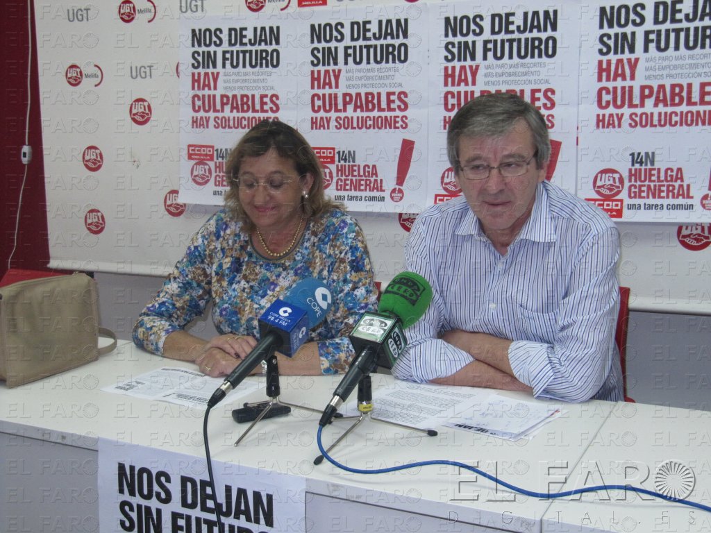 El secretario general de UGT, Alonso Díaz, y la máxima dirigente de CCOO, Caridad Navarro anunciaron ayer que ya han comunicado en la Delegación del Gobierno de la ciudad la convocatoria de huelga general de próximo 14 de noviembre. Navarro destacó que Melilla es una “ciudad complicada de movilizar”, pero que en cualquier caso lo más importante no es cuántas personas acudan a la manifestación, sino que la causa de la misma es justa. La secretaria general de CCOO indicó que desde el sindicato animan a todos los melillenses a que participen en este paro, pero señaló que el hecho de que haya ciudadanos que decidan no acudir no quiere decir éstos estén de acuerdo con las políticas que está llevando a cabo el Gobierno de Rajoy. No obstante, Navarro insistió en que la causa de esta manifestación está “más que justificada” y recordó a los melillenses que perder un día de salario no es un sacrificio tan grande como perder los derechos laborales que han ido adquiriendo durante años. La sindicalista apuntó que esperan que esta huelga haga pensar al Gobierno que el camino que ha emprendido no es el más acertado. Además, señaló que los ciudadanos no pueden quedarse con los brazos cruzados y que quizás si la sociedad se hubiera movilizado antes, muchos de los recortes no se habrían producido. “ En lugar de avanzar, estamos retrocediendo”, indicó la secretaria general de CCOO. Por su parte, el máximo dirigente de UGT en Melilla aseguró que el 99% de los ciudadanos está sufriendo las consecuencias de las políticas de recortes del Gobierno central y que la huelga del 14 de noviembre tiene que ser algo más que un paro. “Tenemos que exigir un cambio radical de rumbo”, señaló Díaz. Asimismo, el secretario general de UGT dijo que es “triste” que el Gobierno de Rajoy presuma de cumplir con el límite del déficit público, cuando las consecuencias de esto están siendo más paro y menos capacidad adquisitiva para las familias. “Están mordiendo las rentas más bajas”, apostilló Díaz. El ugetista apuntó que esta movilización es una muestra de que los sindicatos están en contra de las políticas “erróneas y poco razonables” que se están llevando a cabo desde el Ejecutivo central. Asimismo, destacó que el aumento del desempleo es una muestra de que las acciones que ha puesto en marcha el Gobierno no están dando ningún resultado. En este sentido, animó a los melillenses a acudir al paro del próximo 14 de noviembre. “La huelga será un antes y un después”, aseveró.