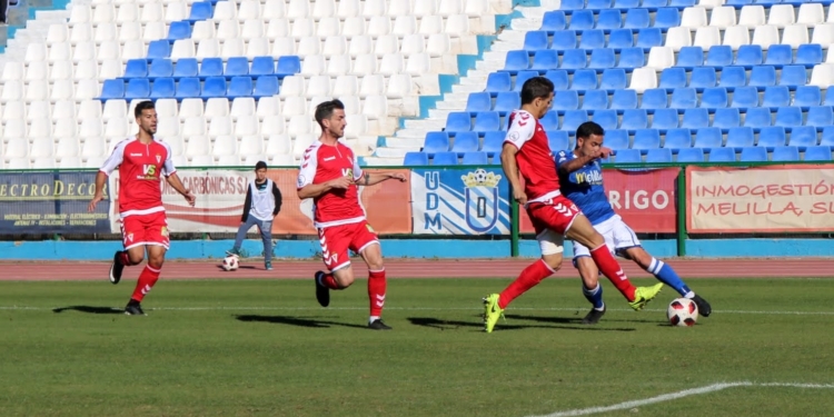 La UD Melilla no pudo despedir el año con victoria frente a un Real Murcia que supo controlar un partido igualado en el que quizás el reparto de punto hubiera sido lo más justo, pero en el que la efectividad del equipo granate fue suficiente para doblegar al líder con un Dani Aquino espectacular que anotó los dos goles de su equipo.