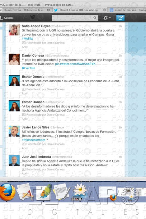 El retraso de la implantación de las nuevas titulaciones en el Campus de Melilla ha sido un varapalo para la Universidad de Granada, pero también ha supuesto un ‘jarro de agua fría’ para el Gobierno de la Ciudad, que el viernes mostraba su confianza en que finalmente la institución educativa pudiera encontrar una solución. El tema se convirtió ayer en el protagonista de la mayoría de las conversaciones de los políticos de nuestra ciudad a través de la red social Twitter. Mientras que los miembros del Ejecutivo local aprovecharon este espacio para defender su gestión e insistir, tal y como hizo el viernes el presidente, Juan José Imbroda, en que la responsabilidad era de la UGR, por parte de la oposición atacaron la gestión del Gobierno local. No obstante, la posición de la Ciudad fue cambiando a lo largo de la tarde y finalmente la responsabilidad no sólo se quedó sobre la Universidad, sino que también recayó en la Junta de Andalucía