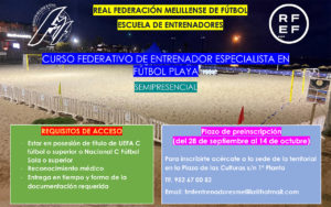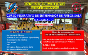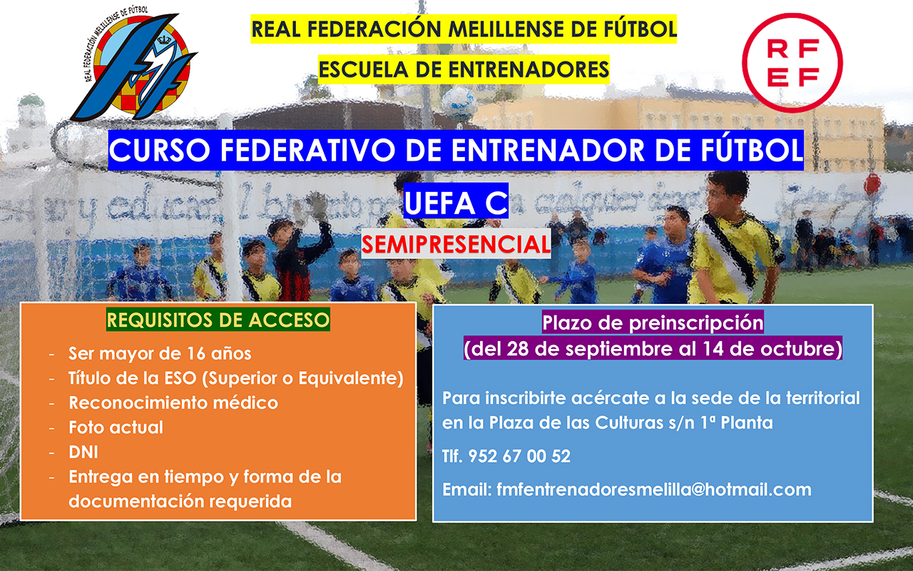 Estos tres cursos se impartirán de manera semipresencial y todos los interesados podrán inscribirse desde el día de hoy y hasta el próximo 14 de octubre en la sede de la Real Federación Melillense de Fútbol, sita en Plaza de las Culturas s/n 1ª Planta.