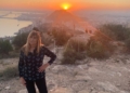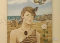 La tercera obra, la de mayor formato, “respira” más: hay más aire en el cielo y más espacio alrededor de la figura, como si el cuadro necesitara distancia para que aparezca lo onírico. La mujer se instala en primer plano —en esa lógica de Asensi de poblar el paisaje, porque un entorno vacío le resulta triste— y el territorio se despliega entre arena, rocas y horizonte. El lugar, según explica, es una mezcla nacida de su cabeza: una simbiosis entre las playas de San José (Almería) y otra Menorca más árida y escarpada. No es una copia literal, sino una síntesis emocional de lo que ella entiende como su “sitio de recreo”, ese espacio donde estar bien, inspirado también por la carga afectiva de una canción de Antonio Vega.
