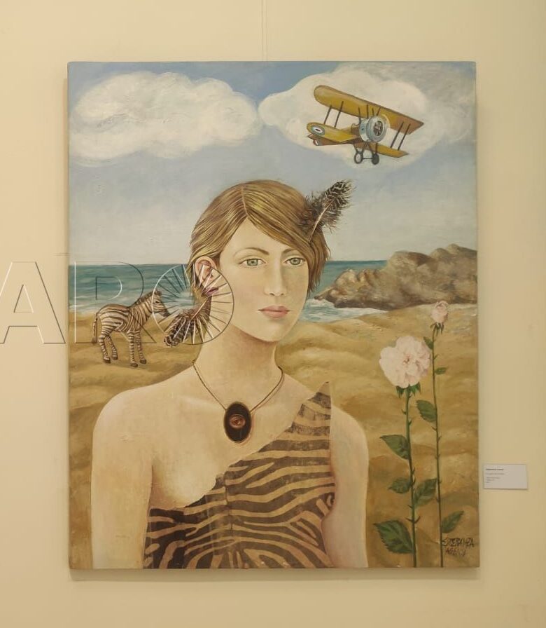 Ahí entra el giro surrealista y simbólico. En esta pintura aparecen elementos que no encajan en un naturalismo estricto —un pequeño avión en el cielo, una cebra en la arena— y, lejos de ser caprichos, forman parte de su manera de contar: paisajes oníricos donde los signos actúan como palabras. La cebra, dice, es un animal protegido, exótico, raro; su presencia en un lugar que “no existe” refuerza el carácter de sueño. En los sueños todo es incoherente y salen cosas extrañas: Asensi usa esa lógica para construir una realidad paralela, más calmada, más habitable, donde la metáfora manda. Incluso la figura vestida con un aire rupestre o prehistórico funciona como deseo simbólico: volver a una etapa en calma, más tranquila que la actual, aunque sea como anhelo.
