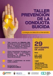 El próximo lunes 29 de septiembre de 2025, la sala de grados de la Facultad de Ciencias de la Educación y del Deporte de la Universidad de Granada (UGR) acogerá el taller 'Prevención de la conducta suicida: estrategias de detección e intervención', una formación especializada dirigida a profesionales del ámbito social y sanitario y organizada por la asociación Feafes Melilla Salud Mental.