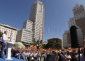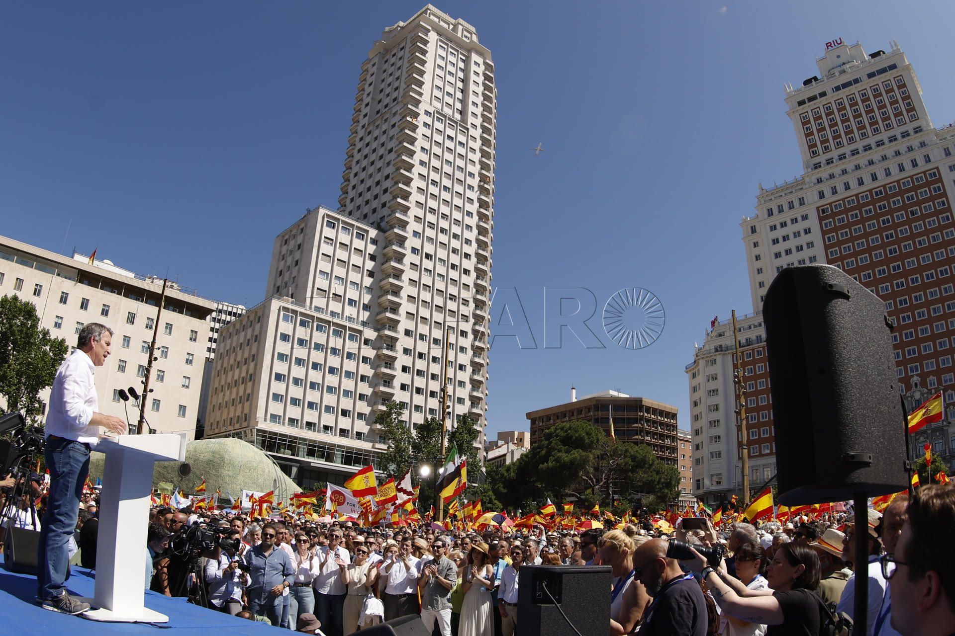 El PP calcula que a la concentración celebrada este domingo en la plaza de España de Madrid han acudido más de 100.000 personas que han llenado el recinto, ocupando también calles aledañas, pero la Delegación del Gobierno rebaja la cifra a entre 45.000 y 50.000 asistentes contra el Ejecutivo de Pedro Sánchez.