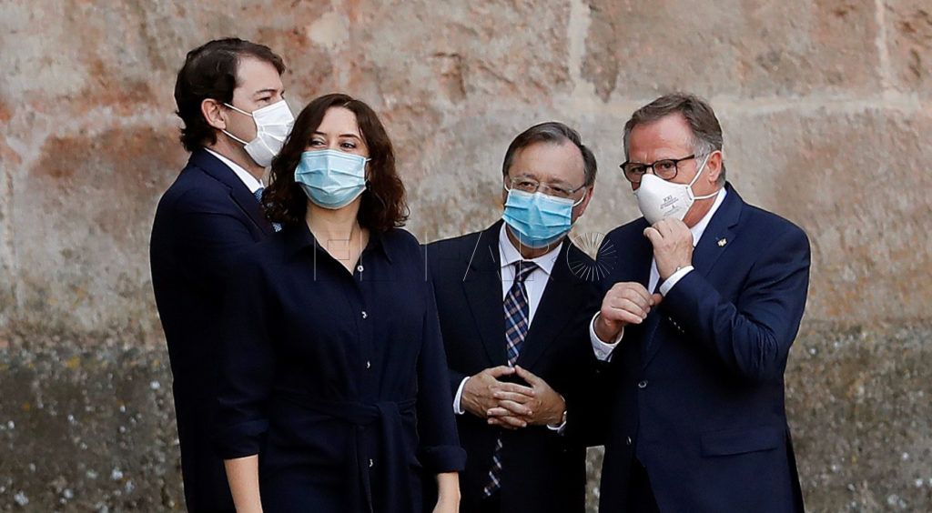 SAN MILLÁN DE LA COGOLLA (LA RIOJA), 31/07/2020.- Los presidentes de Madrid, Isabel Díaz Ayuso, Castilla y León, Alfonso Fernández Mañueco, Ceuta, Juan Vivas y Melilla, Eduardo de Castro (i a d), conversan a su llegada a San Millán de la Cogolla, este viernes, para asistir a la Conferencia de Presidentes donde se buscará el consenso para el reparto de los fondos de recuperación europeos por la crisis del coronavirus. EFE/Chema Moya