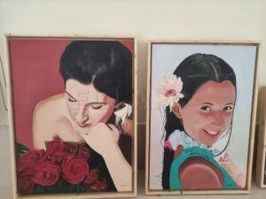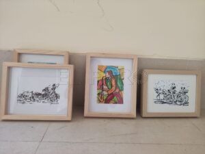 Entrando a mano derecha, Nicolás Sánchez coloca sus cuadros realizados principalmente en óleo, aunque también encontramos alguna obra donde se aprecia la técnica pastel, que aporta la textura necesaria para generar realismo en los pequeños elementos cotidianos, como un paño de cocina. Al otro lado de la sala, entrando a mano izquierda, Peinado sitúa sus cuadros de pirograbado principalmente, pero también obras coloridas realizadas con acuarelas y rotuladores permanentes. Las bases sobre las que sus obras se realizan cobran relevancia, al tiempo que transmiten la capacidad del artista para desenvolverse entre soportes y técnicas diferentes.