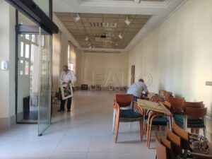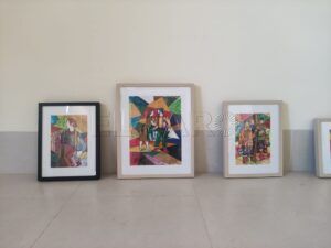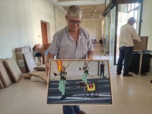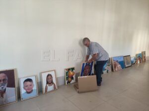 El espacio habilitado comenzaba a ver un movimiento continuado de obras pictóricas que se movían para acá y para allá, pues cada creador dispone las suyas a cada ala de la galería y busca la disposición correcta en el espacio. La distancia entre las obras y la altura a la que se cuelguen cobran un sentido especial para enriquecer el disfrute del observador. Ellos disponen los cuadros enmarcados buscando una sintonía y colocando todo lo necesario en la parte trasera de los mismos, pues después será el turno del encargado de montaje, que llegará con su rayo láser para equilibrar y nivelar todas las obras y colgarlas en la pared. Para Peinado es importante la colocación de cada pieza; cuida el detalle visual, el impacto y la narrativa.