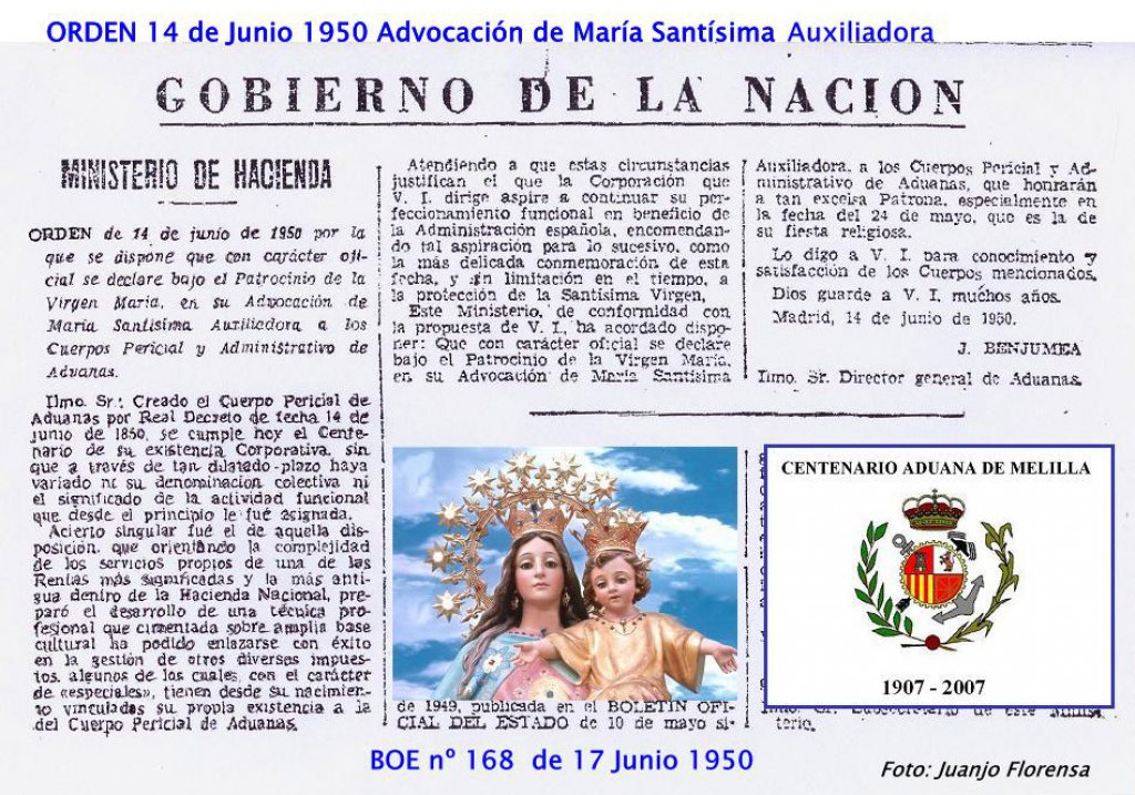 Hoy se cumplirá el 60 aniversario de la celebración de la fiesta religiosa par honrar a la Excelsa Patrona de Aduanas en su Advocación de María Santísima Auxiliadora. En el año 1950 cuando se cumplía el centenario de la creación del Cuerpo Pericial y Administrativos de Aduanas por Real Decreto de 14 de junio de 1850, siendo Ministro de Hacienda –Juan Bravo Murillo (1803-1873)–.