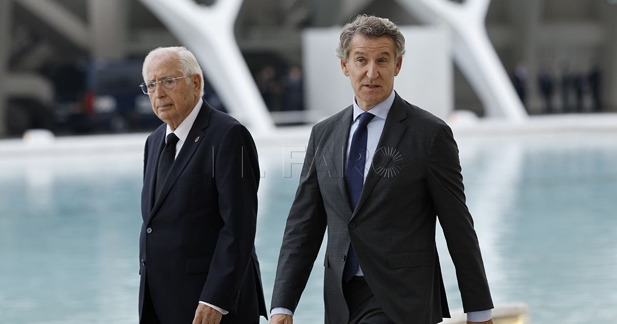 VALENCIA, 29/10/2025.- El presidente del Partido Popular, Alberto N˙Òez FeijÛo (d), y el presidente de Melilla, Juan JosÈ Imbroda (i), a su llegada al funeral de Estado por las 237 vÌctimas de la dana celebrado este miÈrcoles en Valencia con motivo del primer aniversario de la tragedia. EFE/ Kai Forsterling