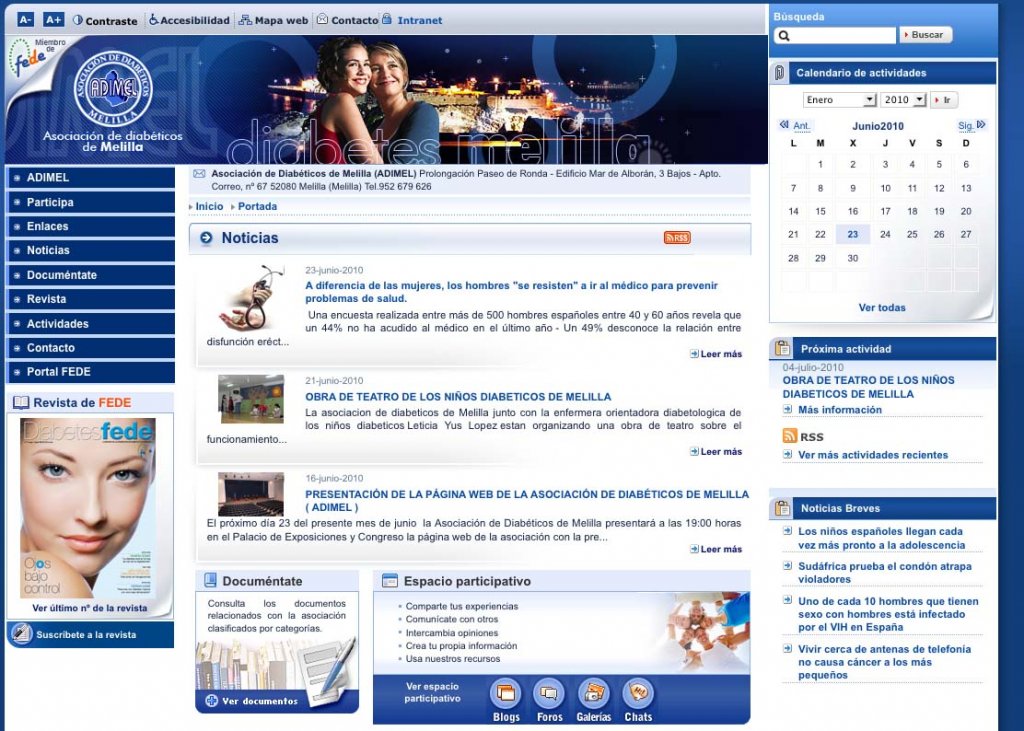 La Asociación de Diabéticos de Melilla (Adimel) presentó esta semana su página web, www.adimel.org, donde los enfermos de diabetes y cualquier persona interesada en la enfermedad o la asociación podrá consultar todo tipo de información desde su propia casa, una de las ventajas de este portal, tal y como señaló el presidente la asociación, Joaquín Rosa, quien destacó que el portal se actualizará cada semana.