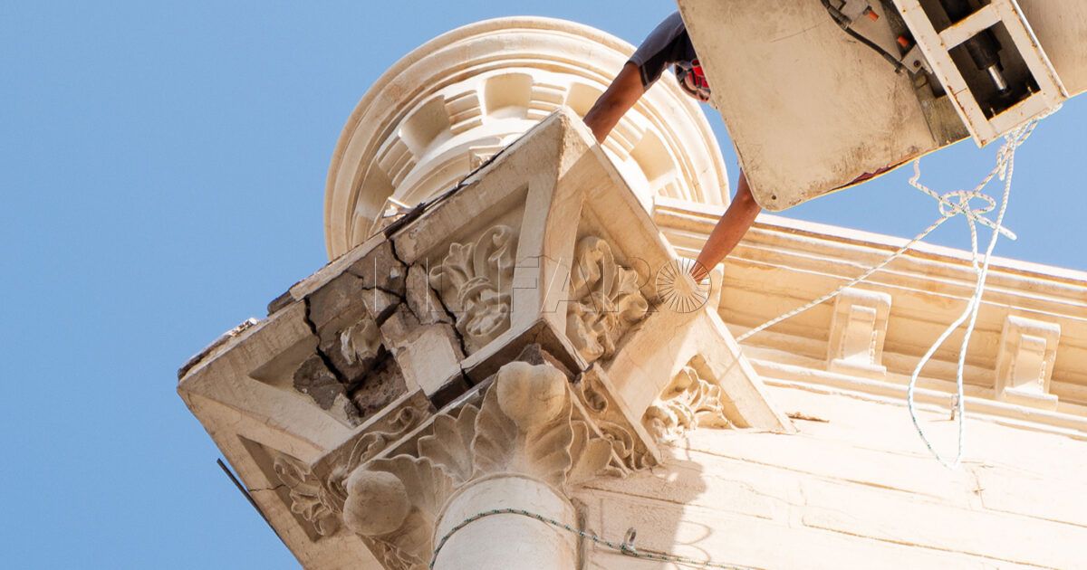 Las imágenes captadas durante los trabajos muestran a operarios especializados trabajando desde plataformas elevadoras en la restauración de las cornisas y capiteles corintios de la fachada principal, elementos arquitectónicos característicos del estilo neorrománico del templo.