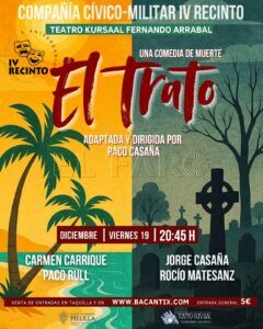 El viernes, día 19 de diciembre, a las 20:45 horas, se pondrá en escena 'El trato', una comedia que promete arrancar amplias sonrisas al público, aunque la presencia de la muerte ronde la trama. Una obra que, sin duda, hará que los espectadores salgan del teatro con un espíritu alegre y satisfecho.