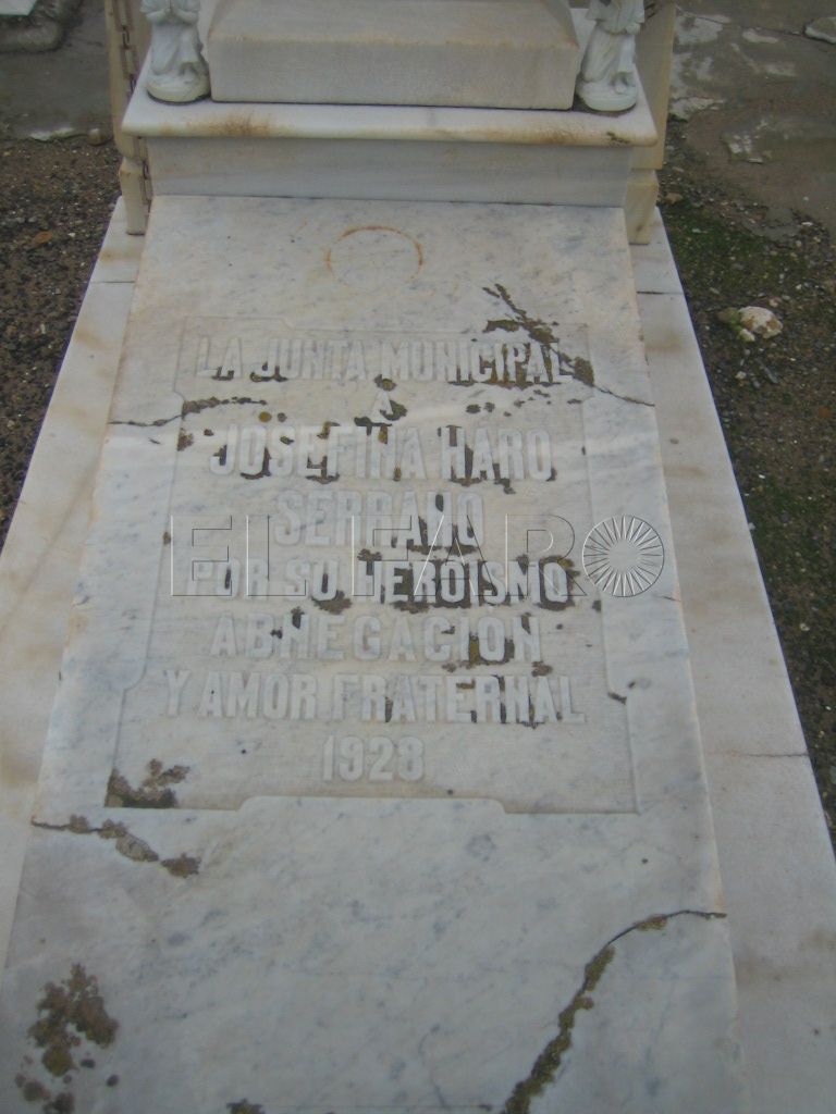 La Junta Municipal, que era el órgano de Gobierno de Melilla por aquellos momentos, le cedió la tumba a perpetuidad, que todavía hoy figura en la parcela 18 del cementerio con la fotografía de la primera comunión de Josefina Haro y una inscripción en la lápida que dice lo siguiente: “Por su heroísmo, abnegación y amor fraternal”.
