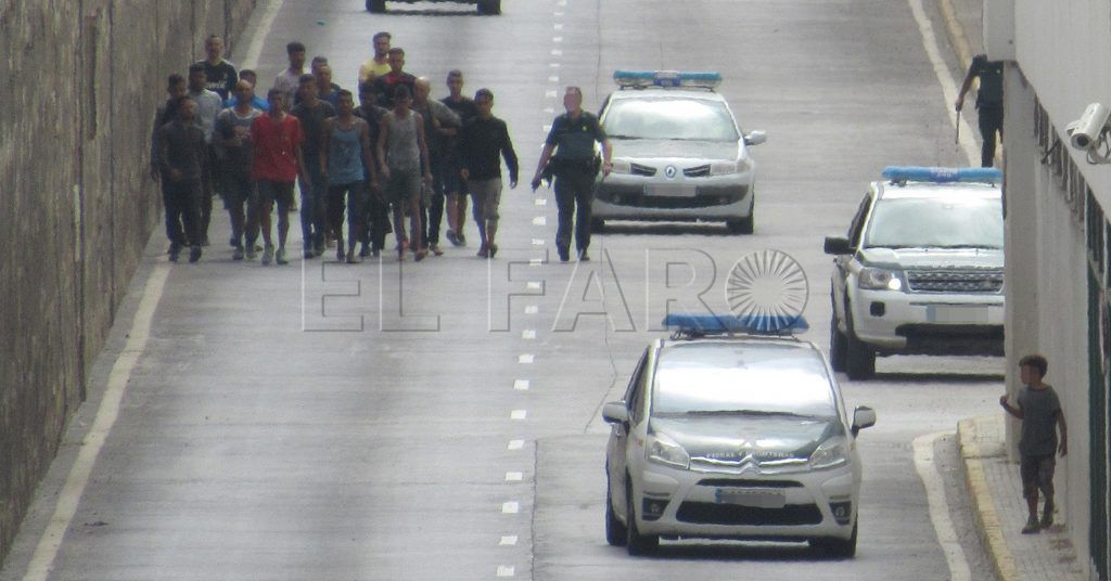 Fuentes de la AEGC aseguraron que escenas como las que se ven estas fotografías se volverán a repetir a diario. En concreto, en la imagen superior se ve a tres vehículos de la Guardia Civil, que acompañaban a un grupo de 19 jóvenes por la carretera de acceso a la zona del puerto comercial sobre las 11:30 horas. Un niño también estaba con ellos, aunque los agentes hablaron con él sin salir del vehículo y finalmente se montó en el coche. Aparece a la derecha de esta fotografía.