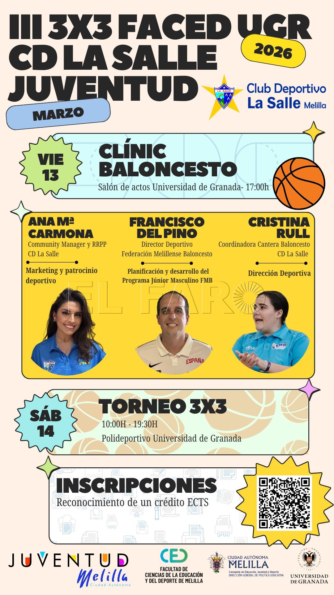 La Consejería de Juventud, el CD La Salle y la Facultad de Ciencias de la Educación y del Deporte (FACED UGR) de Melilla han presentado la III Jornada 3x3 FACED UGR - CD La Salle - Juventud, un evento que se celebrará los días 13 y 14 de marzo y que volverá a situar al baloncesto como protagonista en la ciudad .