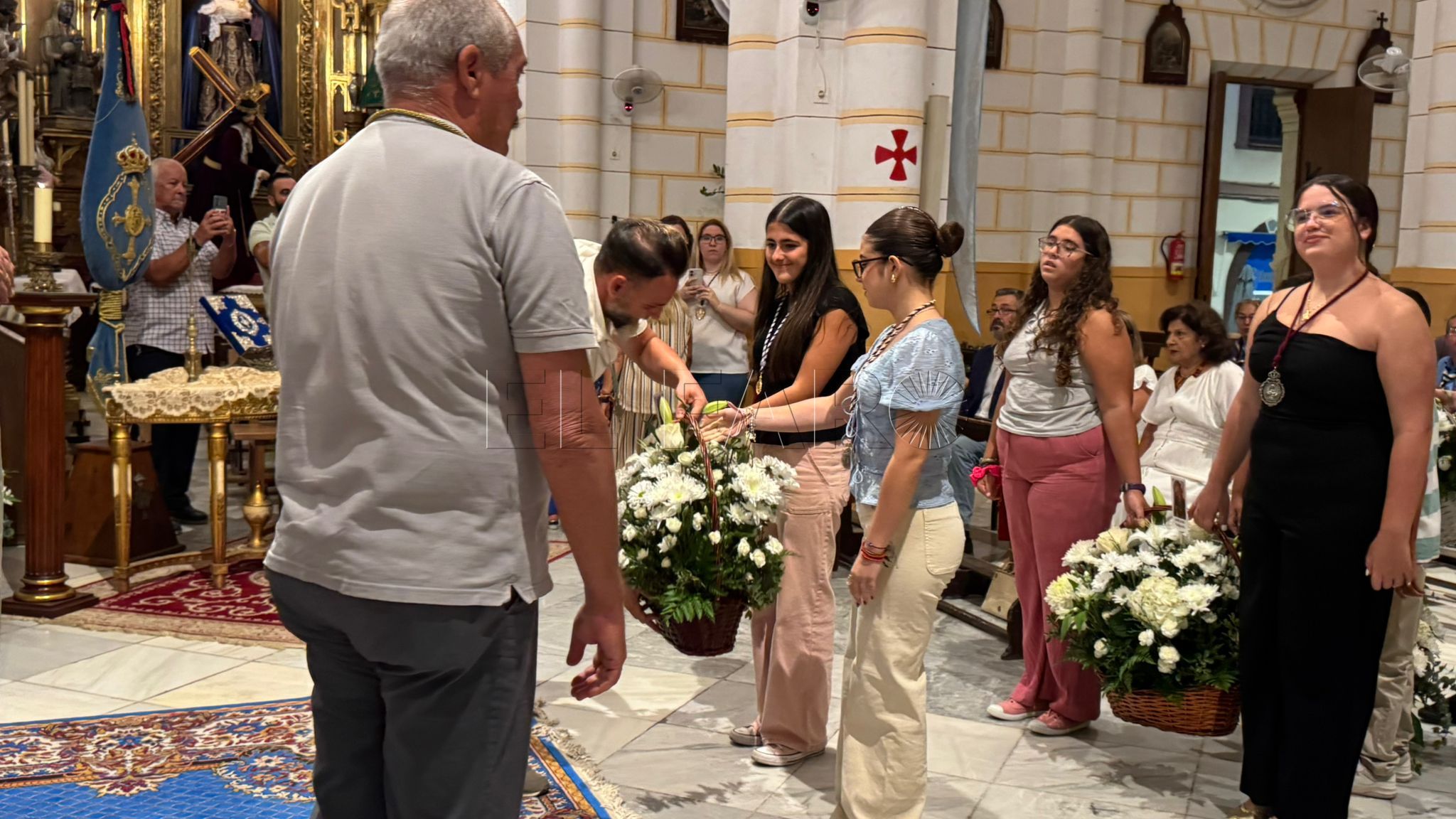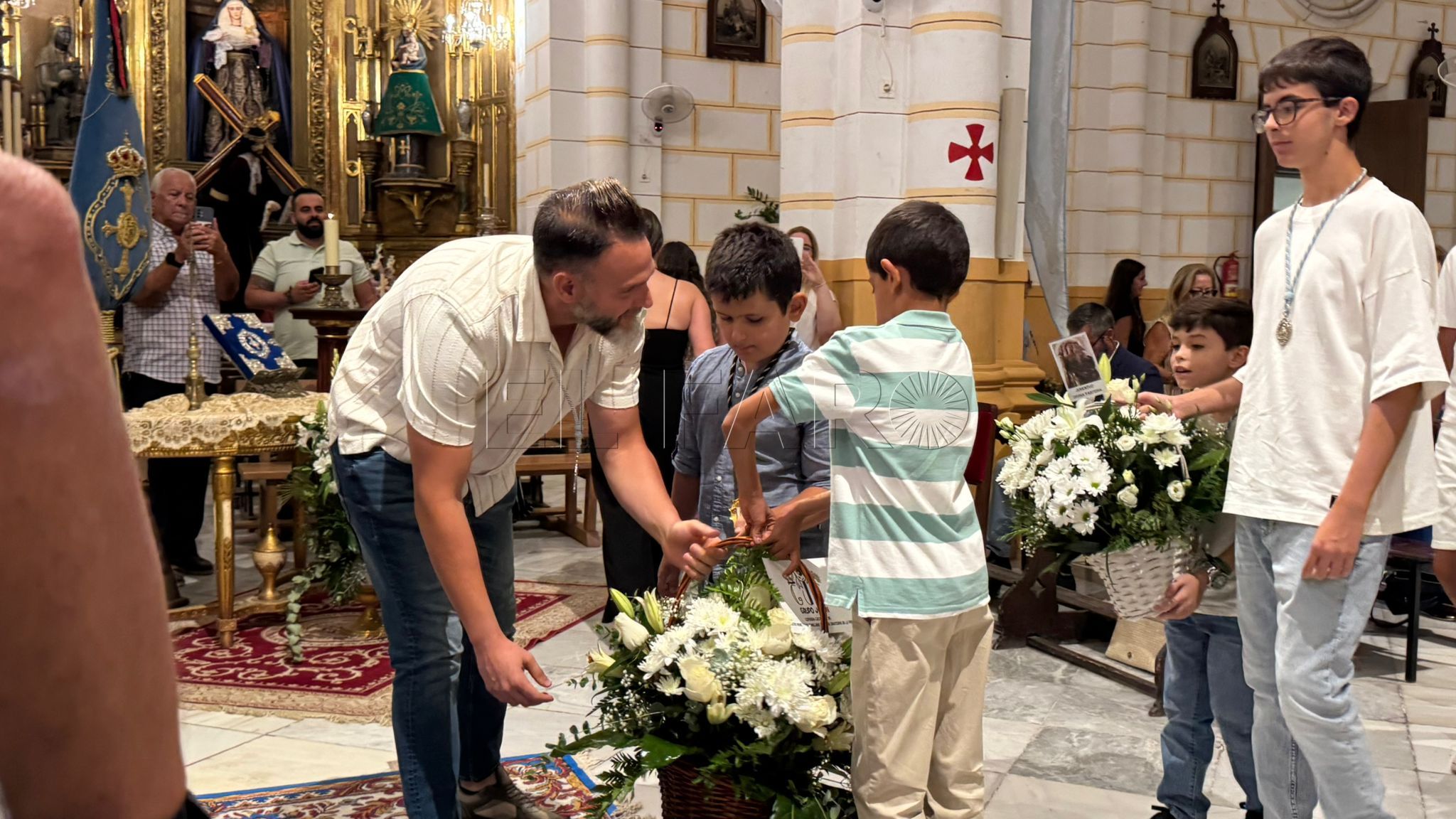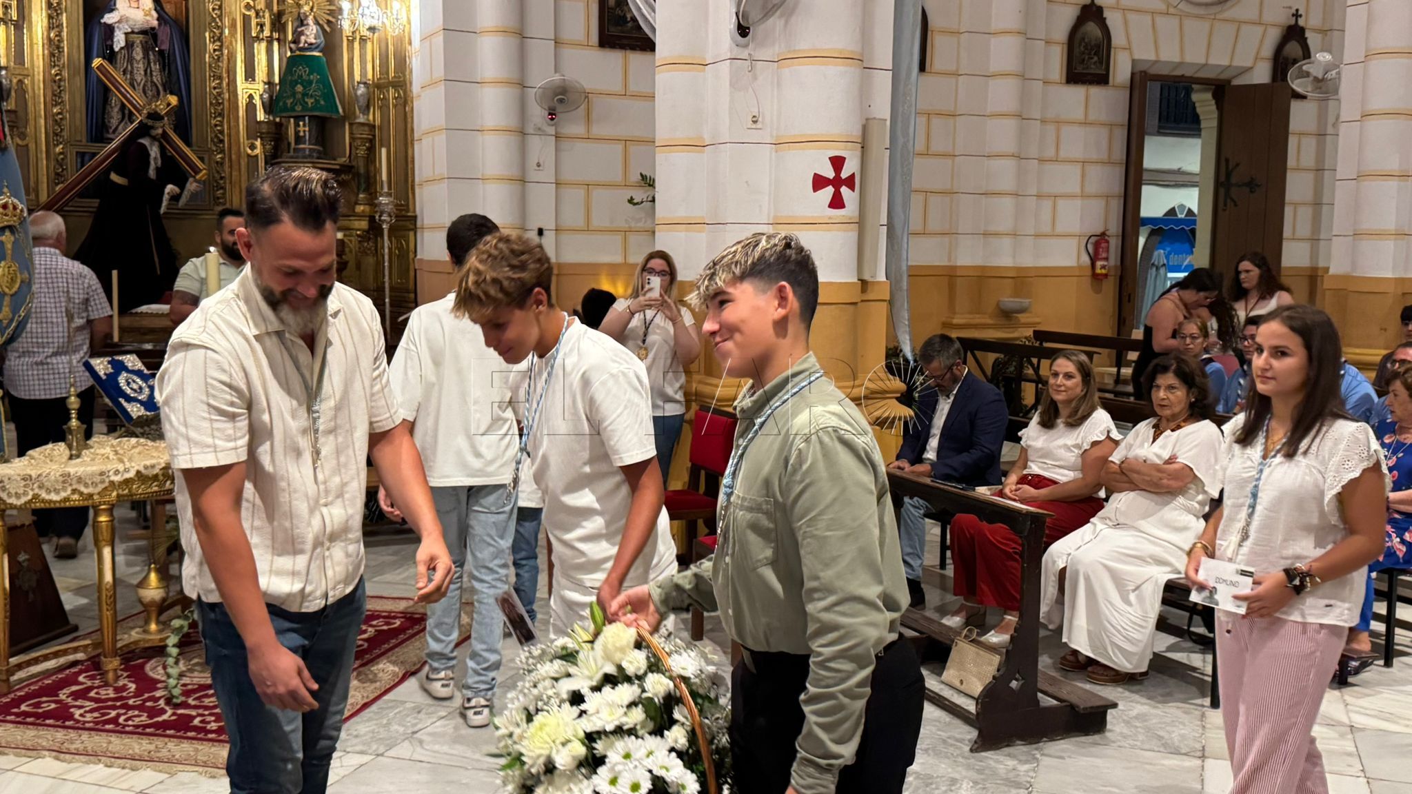 Cada grupo ofreció lo mejor de sí mismo para honrar a la Virgen. Por parte de la Cofradía del Nazareno, Irene e Inés, símbolo de pureza y amor, mientras que Alejandro participó con devoción en la lectura de las preces. Desde la Cofradía de la Flagelación, Elisa y María Jesús presentaron su ofrenda floral, mientras que Natividad se unió a Alejandro en las lecturas. La Cofradía Castrense, representada por los más pequeños, Saúl y Javier, ofreció flores blancas a los pies de la Virgen, gesto sencillo pero lleno de ternura.