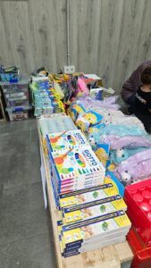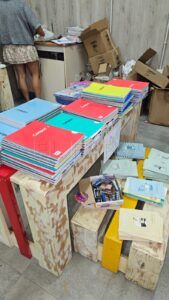 No. Libros de texto hemos tenido algunos que nos han donado de institutos, sobre todo, y los dejamos ahí por si alguien nos decía que su hijo o hija iba a uno de esos institutos pero, el objetivo principal no eran los libros, era el material. Hemos tenido desde mochilas, como 100 mochilas nuevas, de carro y normales, muchísimas. También, libretas, rotuladores, bolis, todo lo que se puede utilizar en los materiales escolares.