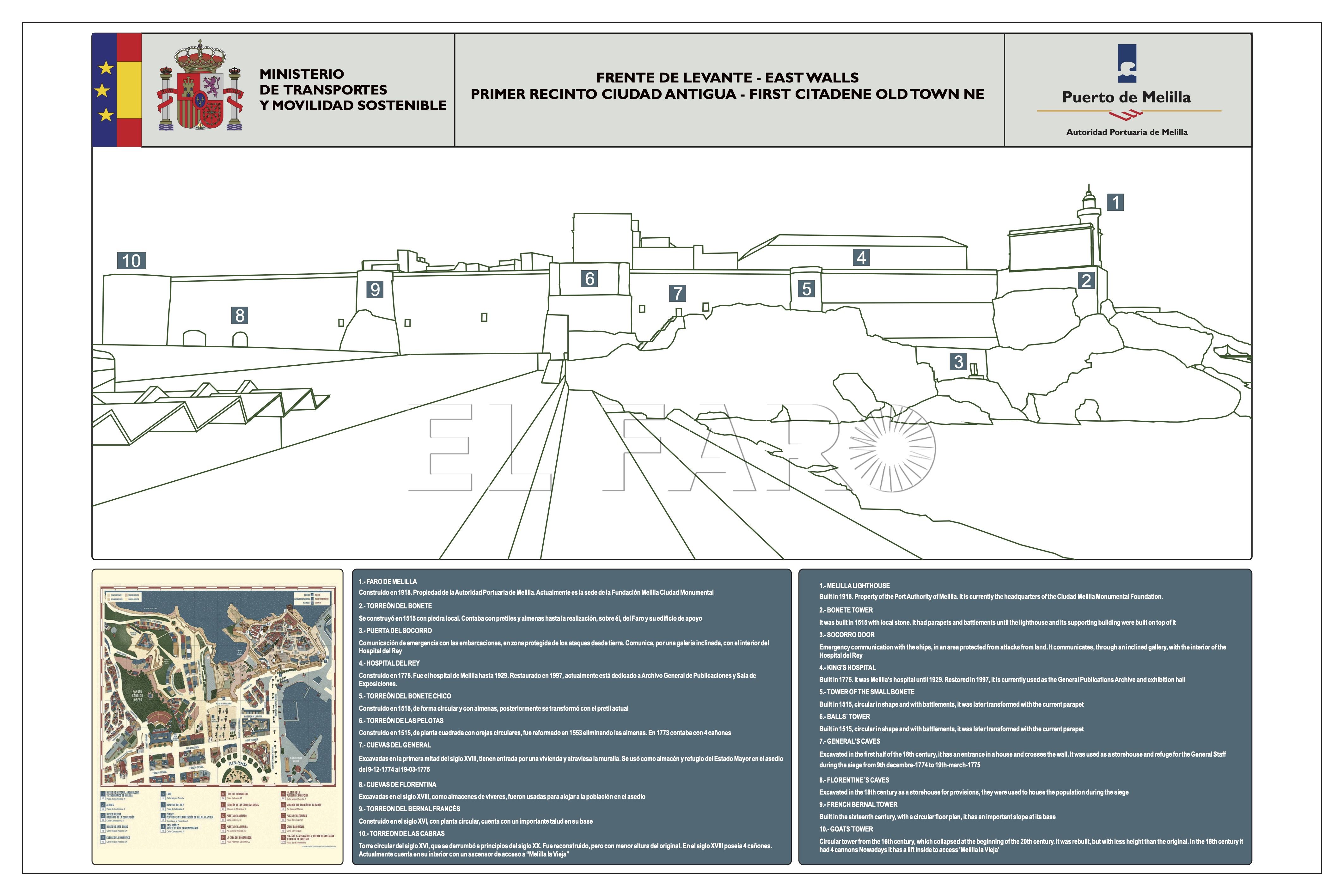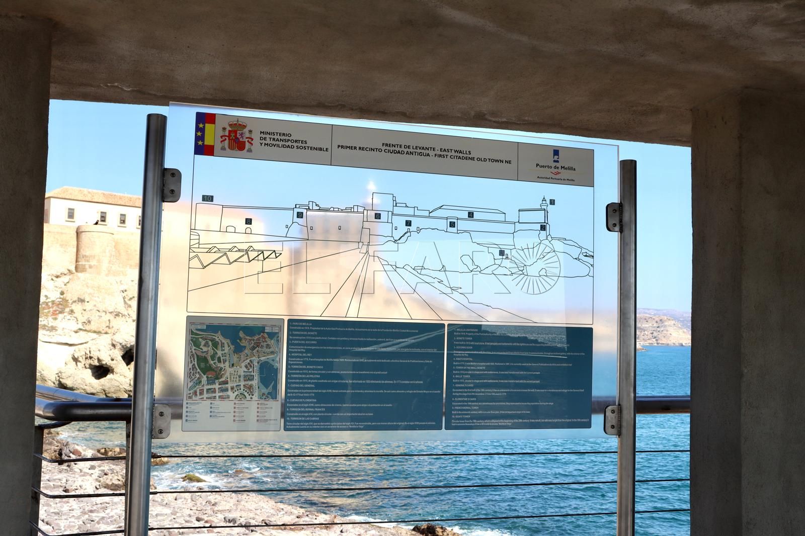 La Autoridad Portuaria de Melilla (APM) ha instalado un panel informativo, en castellano e inglés, en el primer mirador del paseo del espaldón, con el objetivo de facilitar, a melillenses y visitantes, la localización de los distintos elementos de la fortificación que, desde este singular paseo, ofrece la vista del Frente de Levante del Primer Recinto Fortificado de Melilla la Vieja.